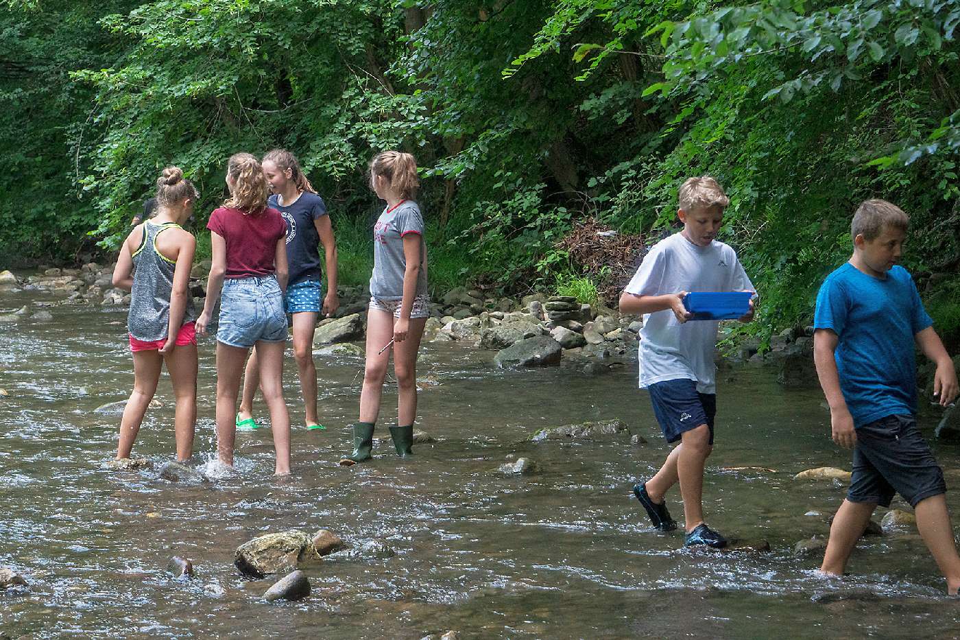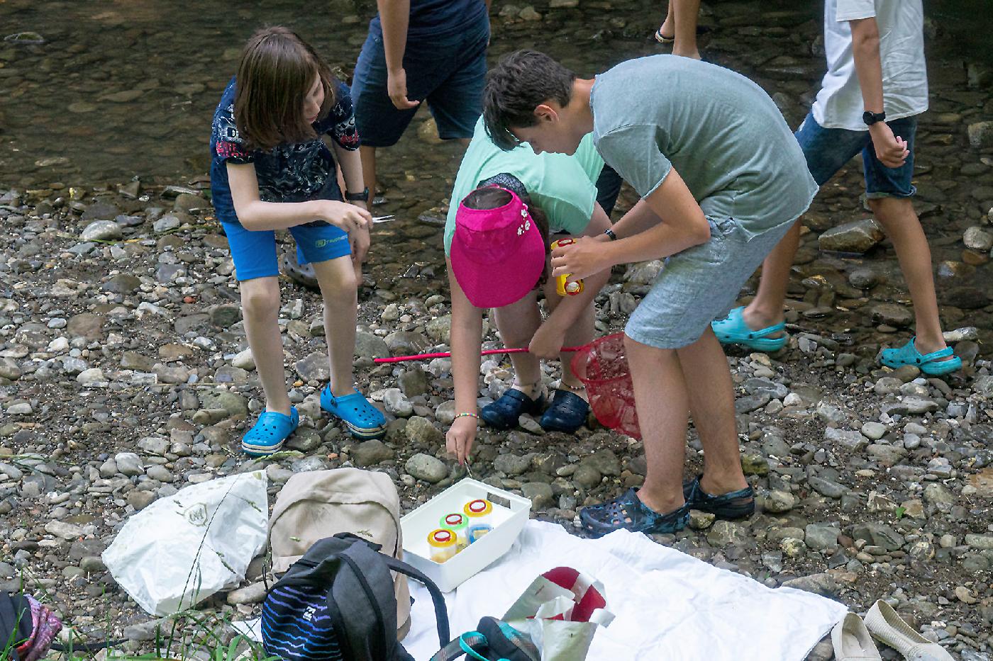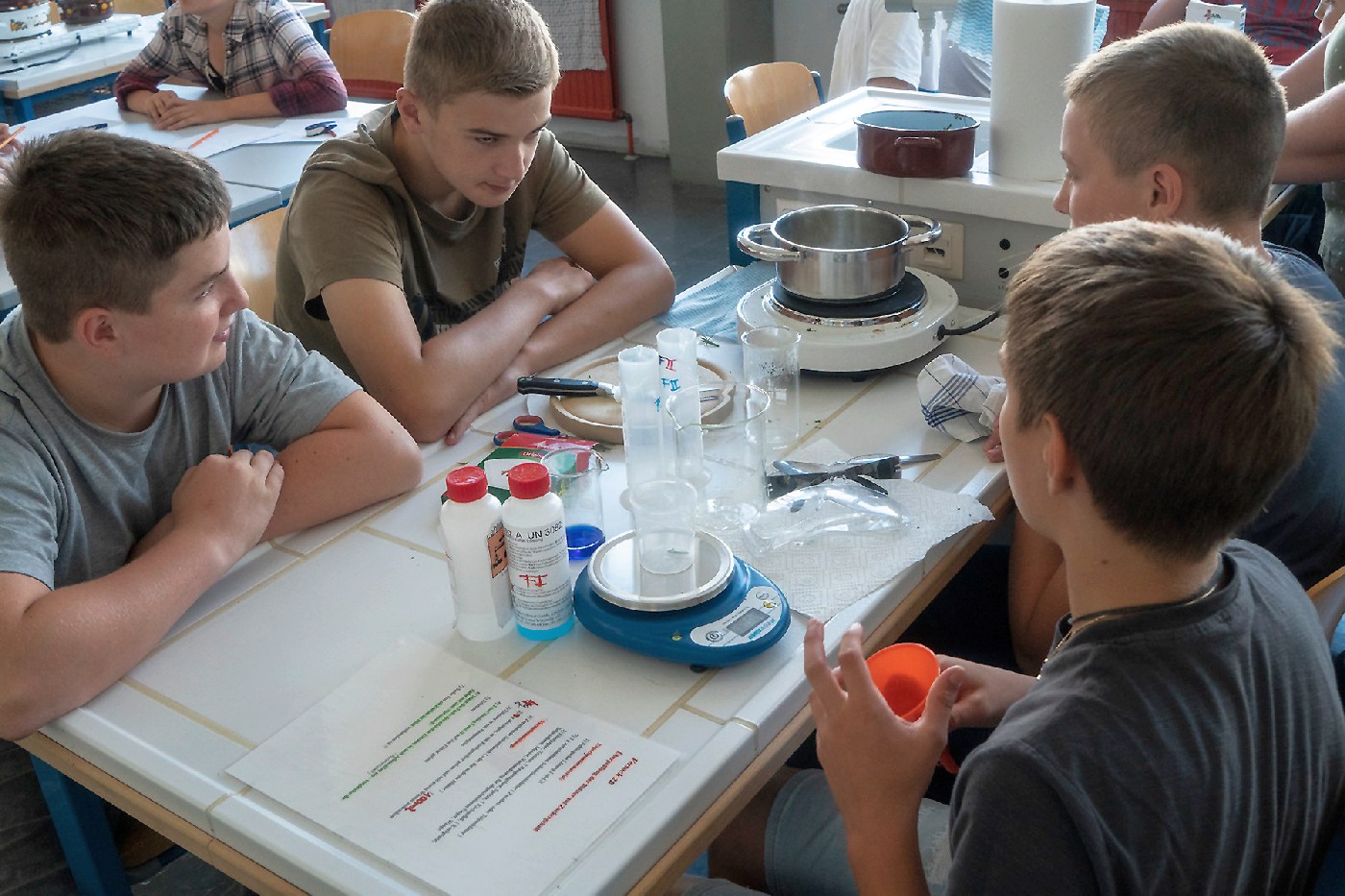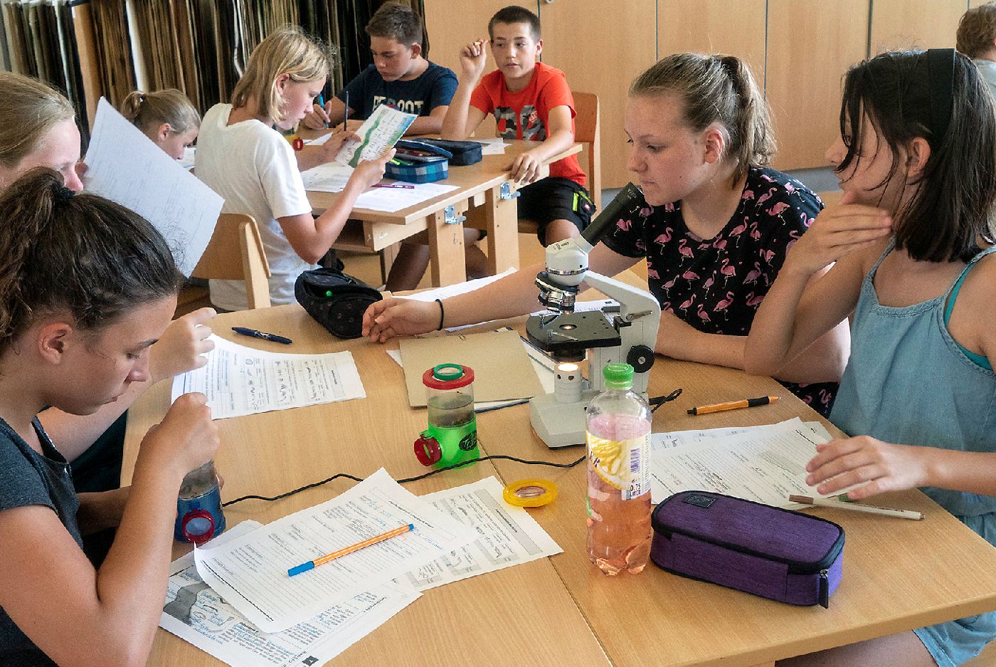 Die 3. Klassen beschäftigten sich bei ihrem Schlussprojekt mit der Photosynthese und mit einer Wasseruntersuchung. Als Nebeneffekt gab es eine Abkühlung von der Hitzewelle im nahen Laabenbach.