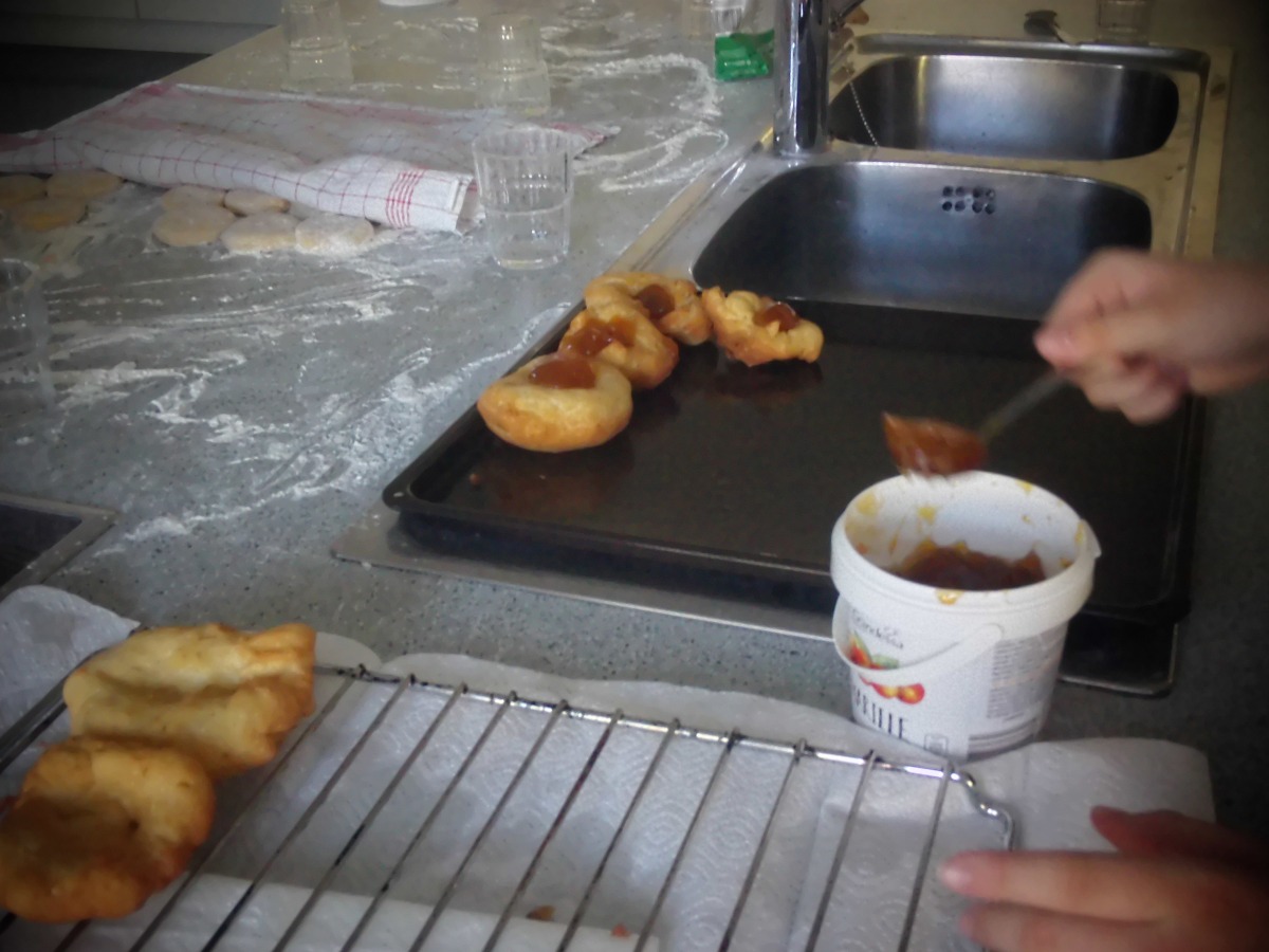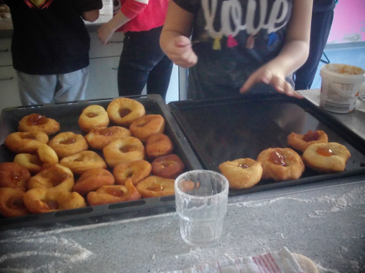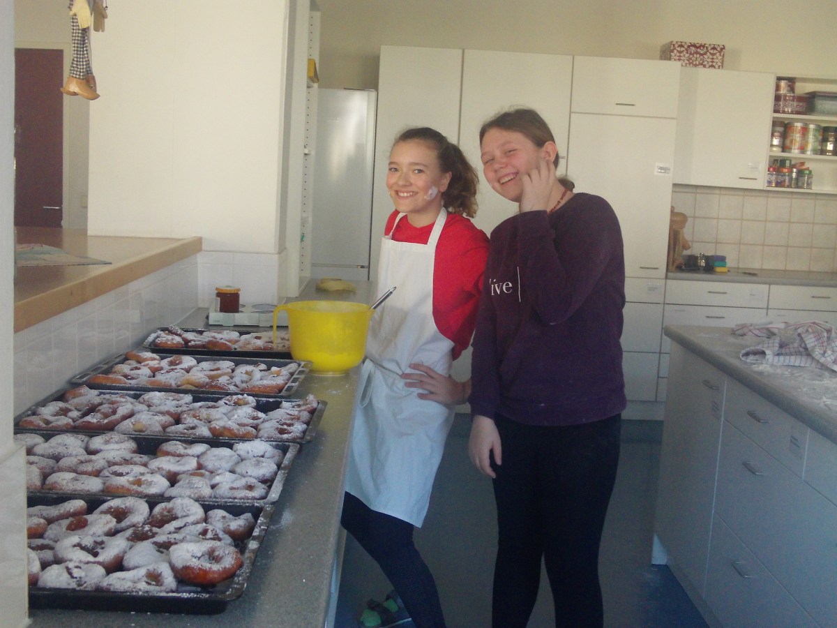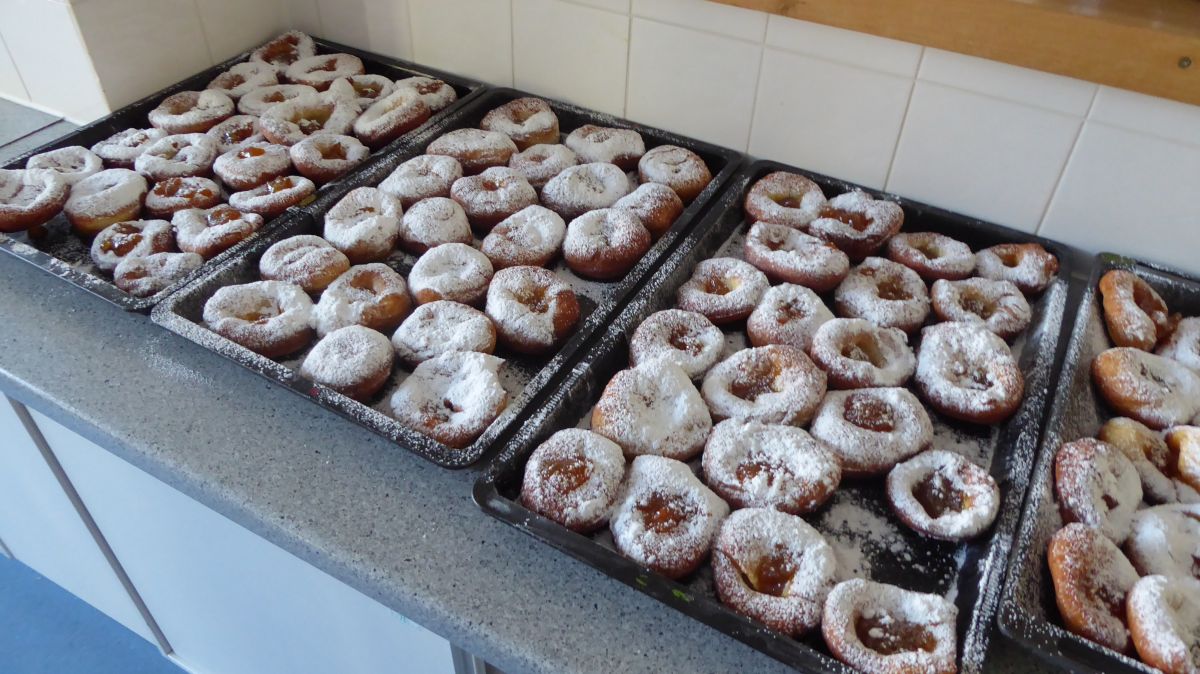 ... ist bei uns das Backen (und genussvolle Verzehren) von Faschingskrapfen am Faschingdienstag. Chef de Cuisine ist immer Thomas Friedl - diesmal mit sehr engagierten Bäckerinnen und Bäckern der 2b, die innerhalb von eineinhalb Stunden 220 Krapfen fertigstellten.