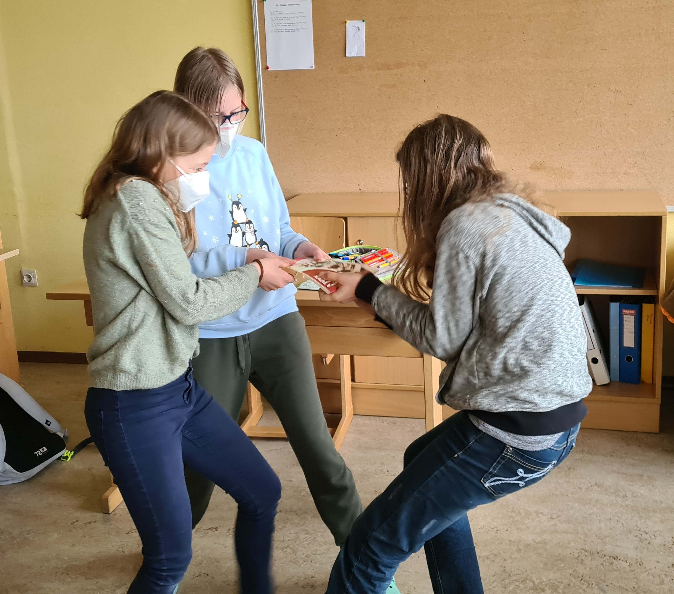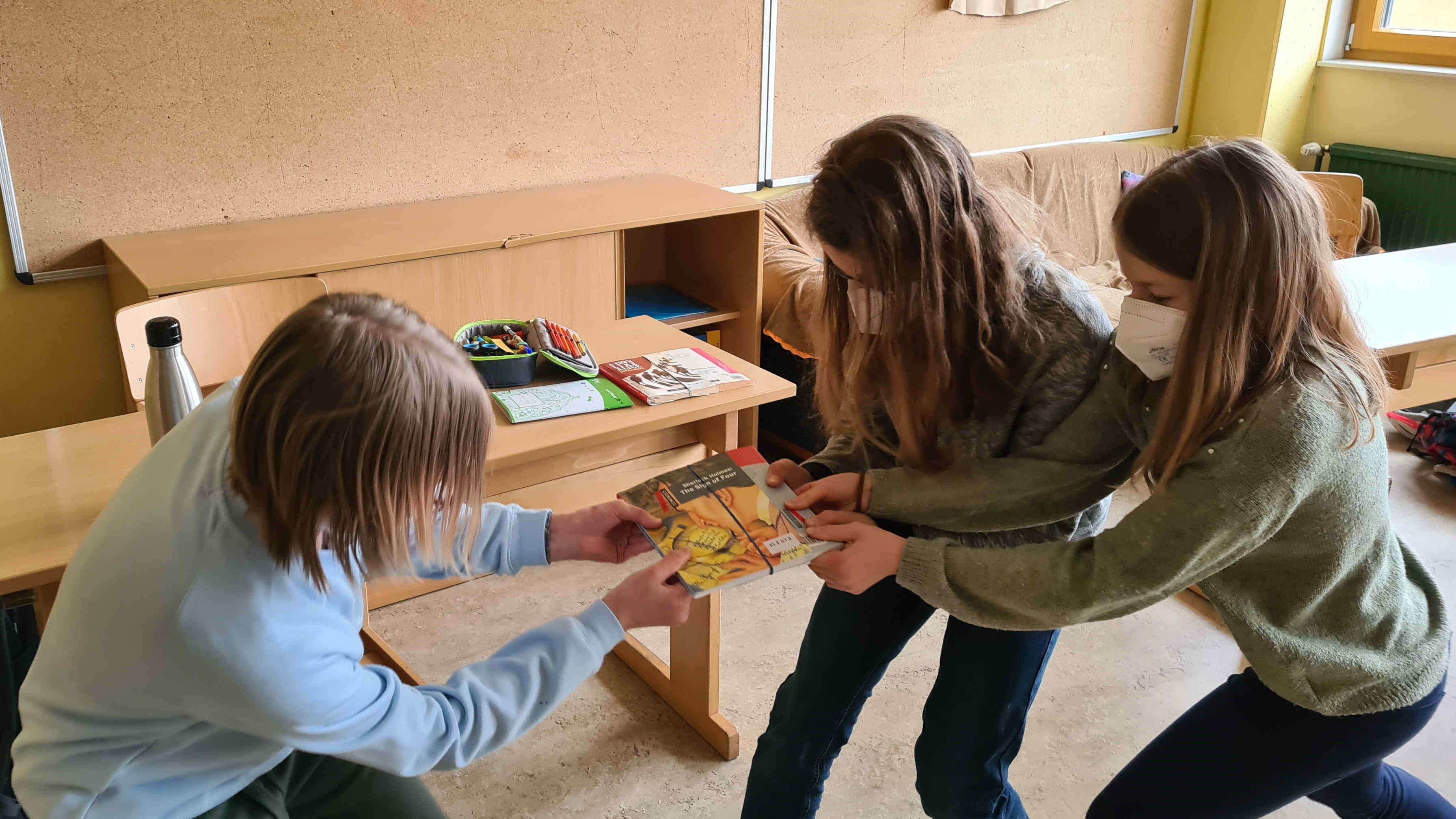 Die Seiten von je zwei Büchern wurden abwechselnd aufeinander gelegt. Anschließend versuchten die Kids die Bücher auseinander zu ziehen. Die Fotos zeigen, dass trotz größter Bemühungen und vereinter Kräfte die Bücher nicht getrennt werden konnten.