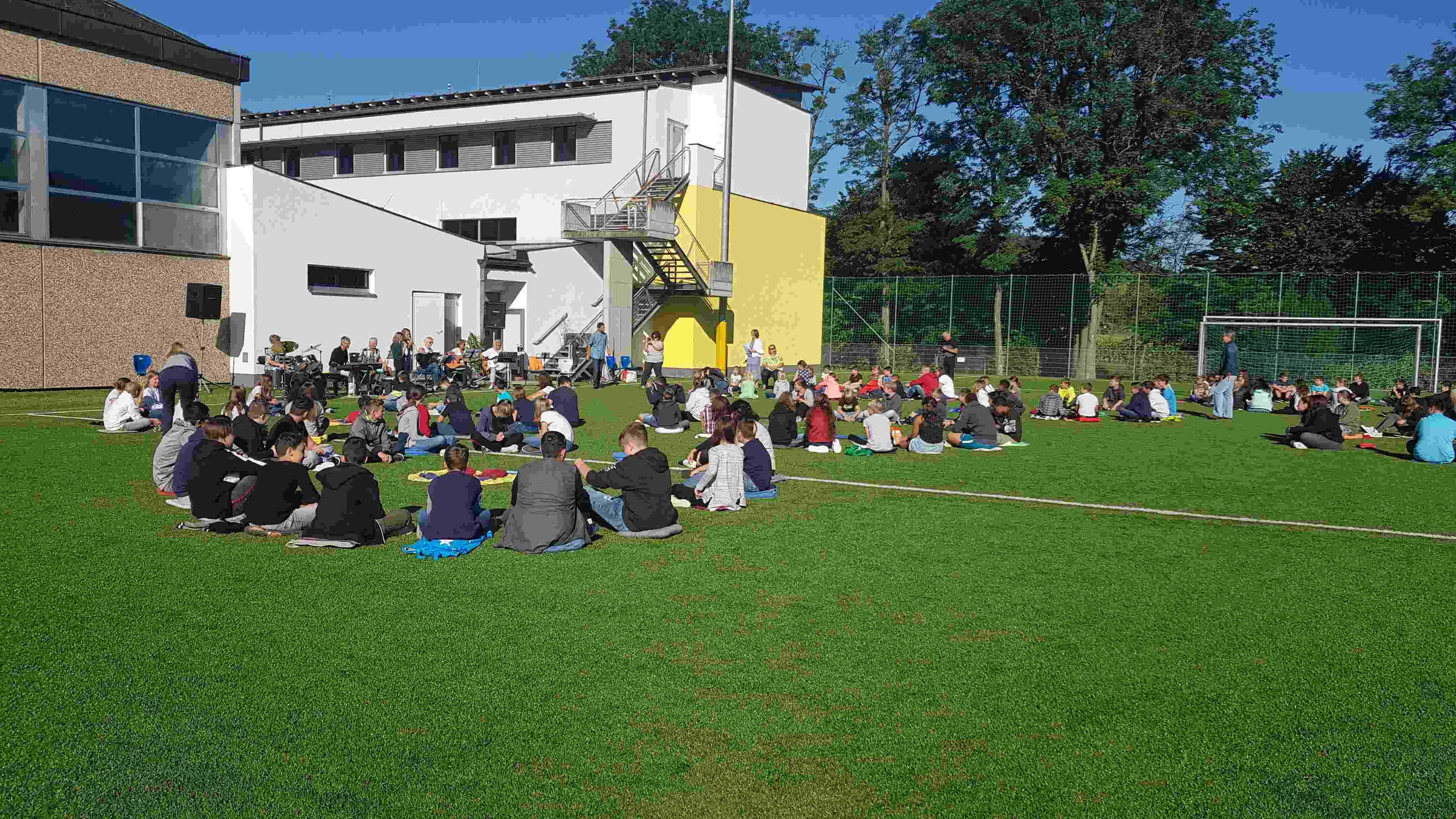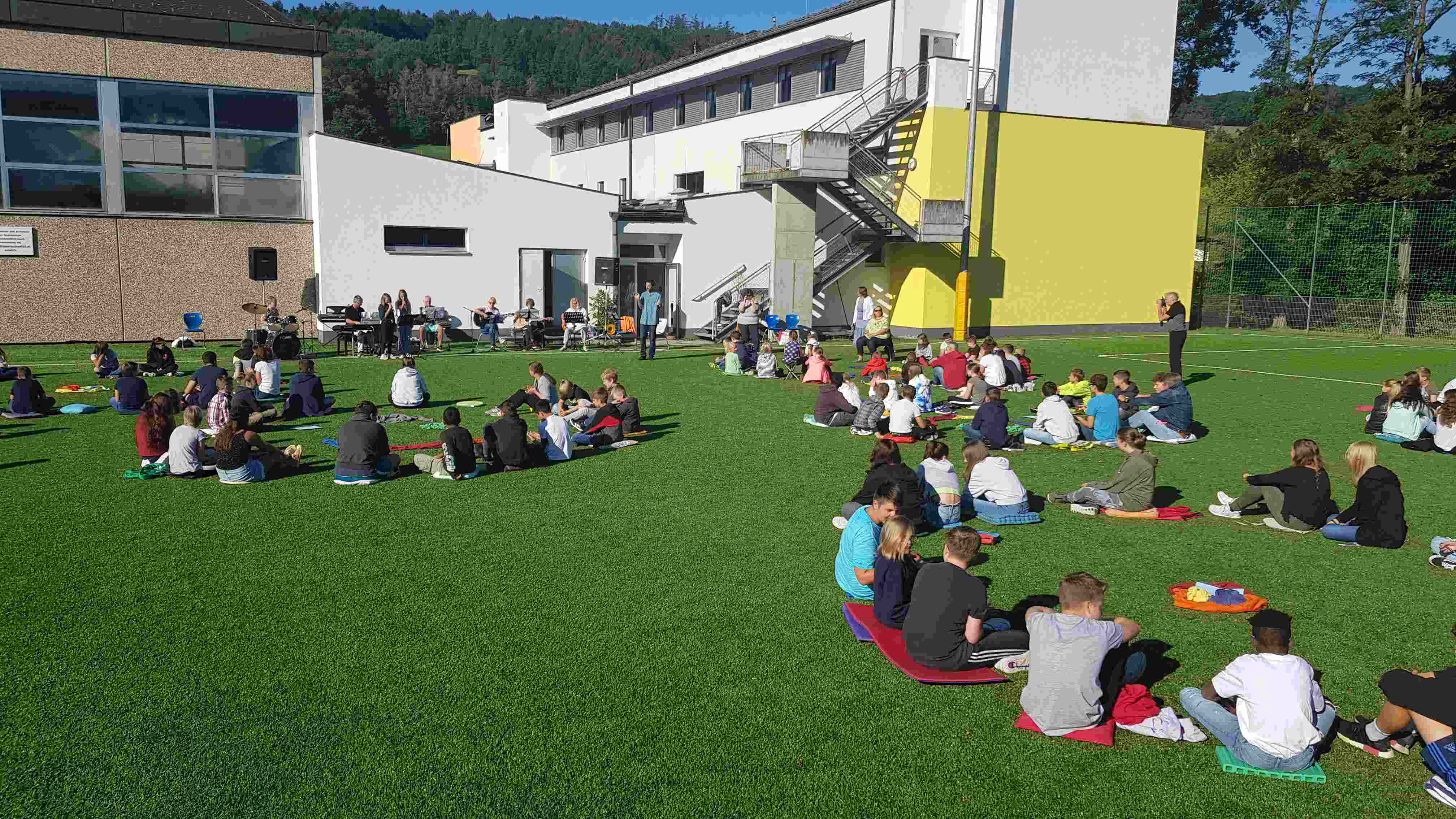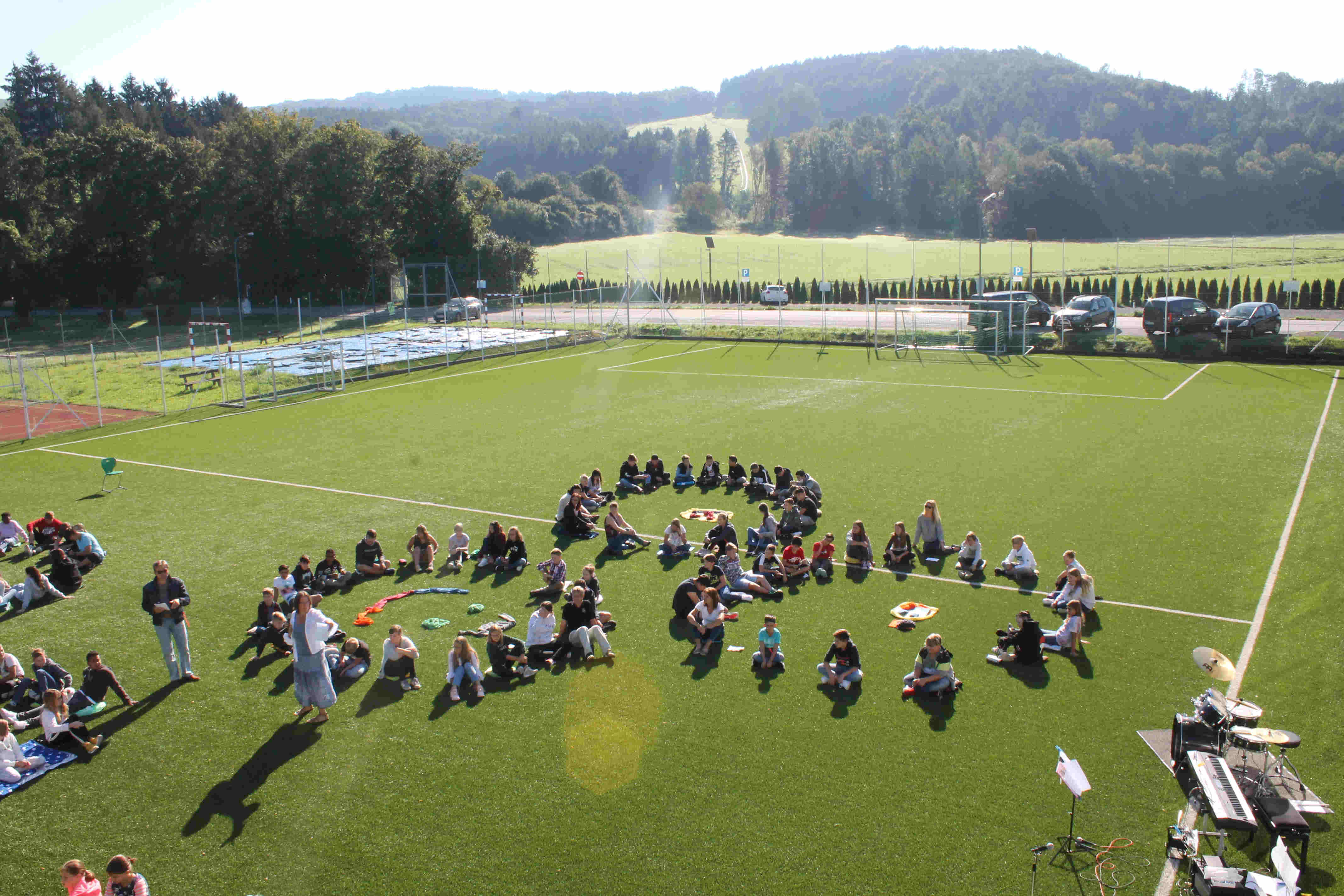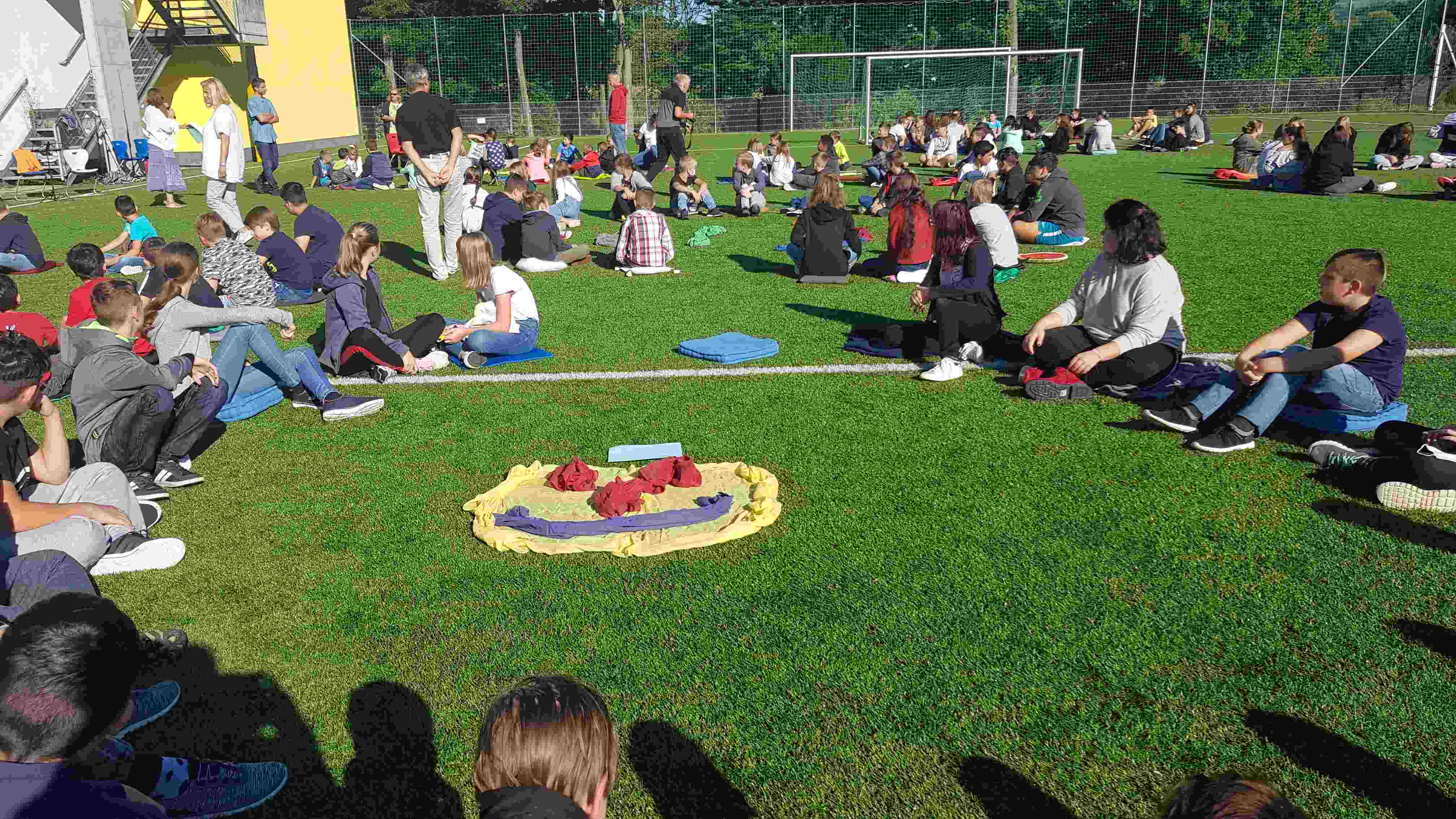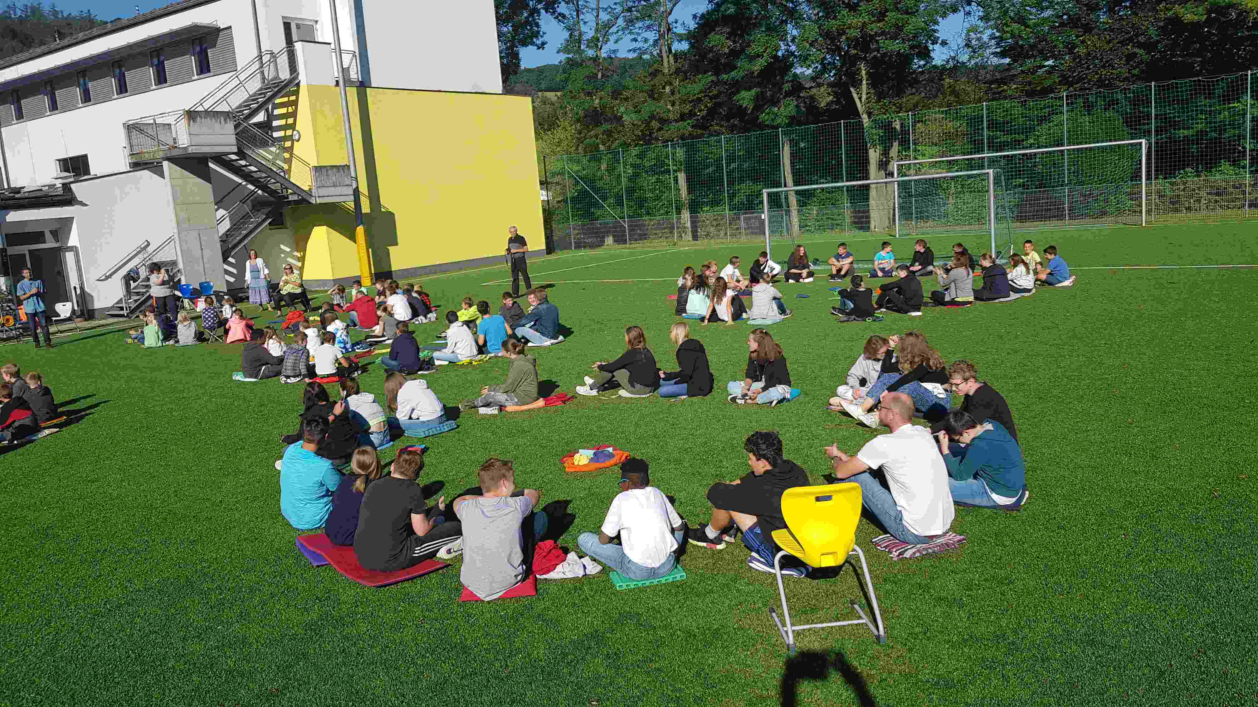 Auf unserem Sportplatz saßen wir klassenweise im Kreis und feierten gemeinsam den Schulbeginn.