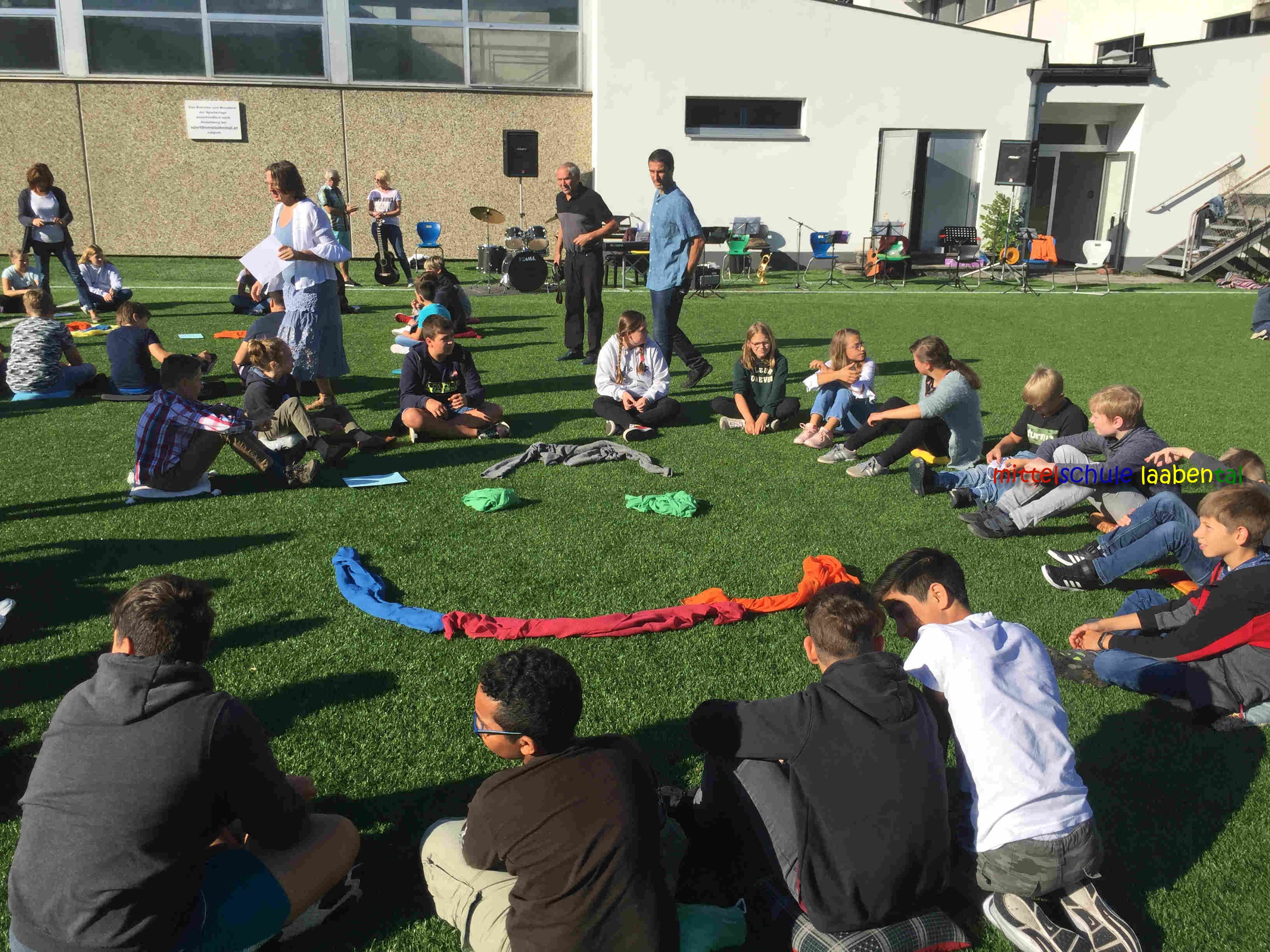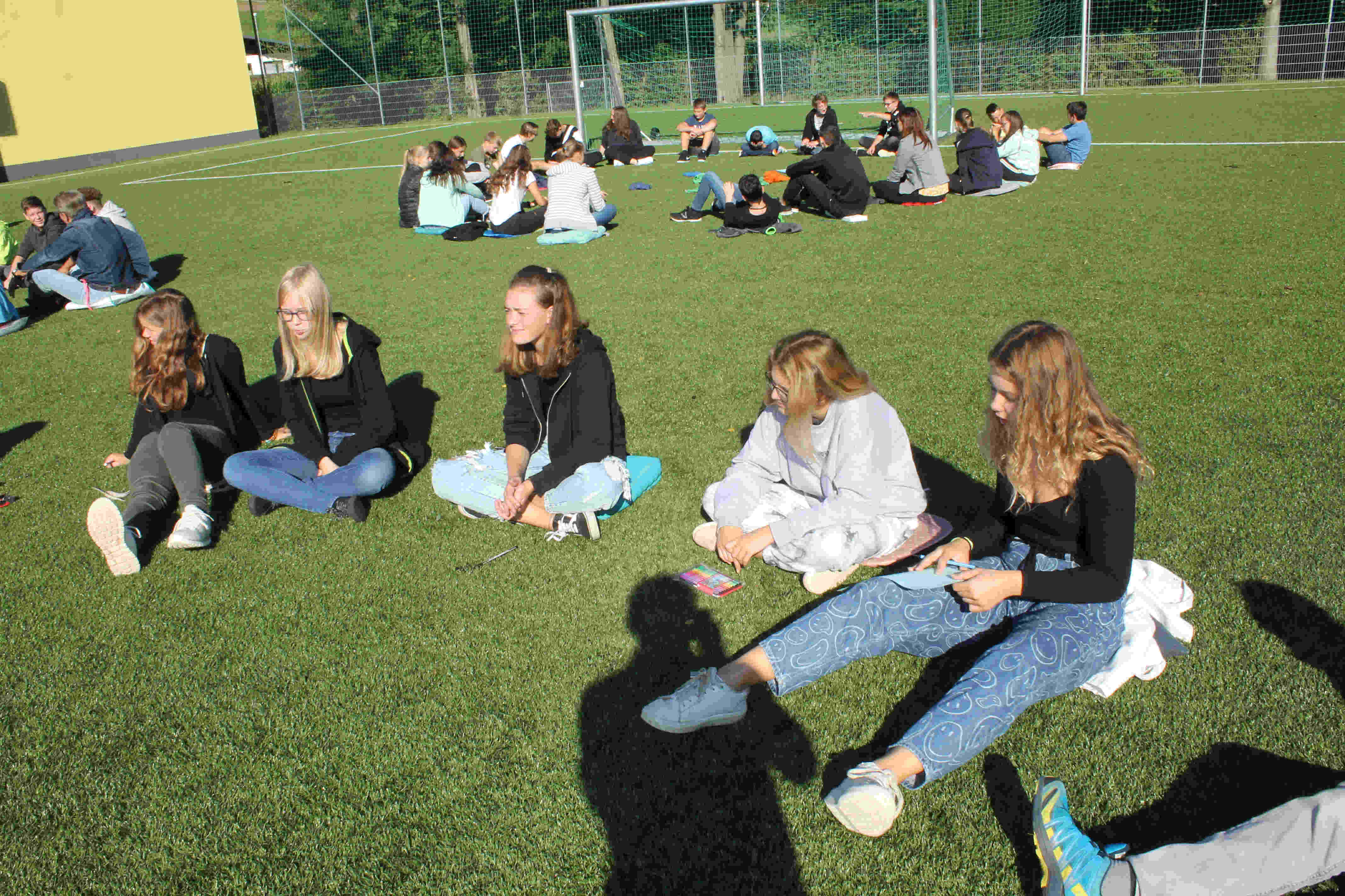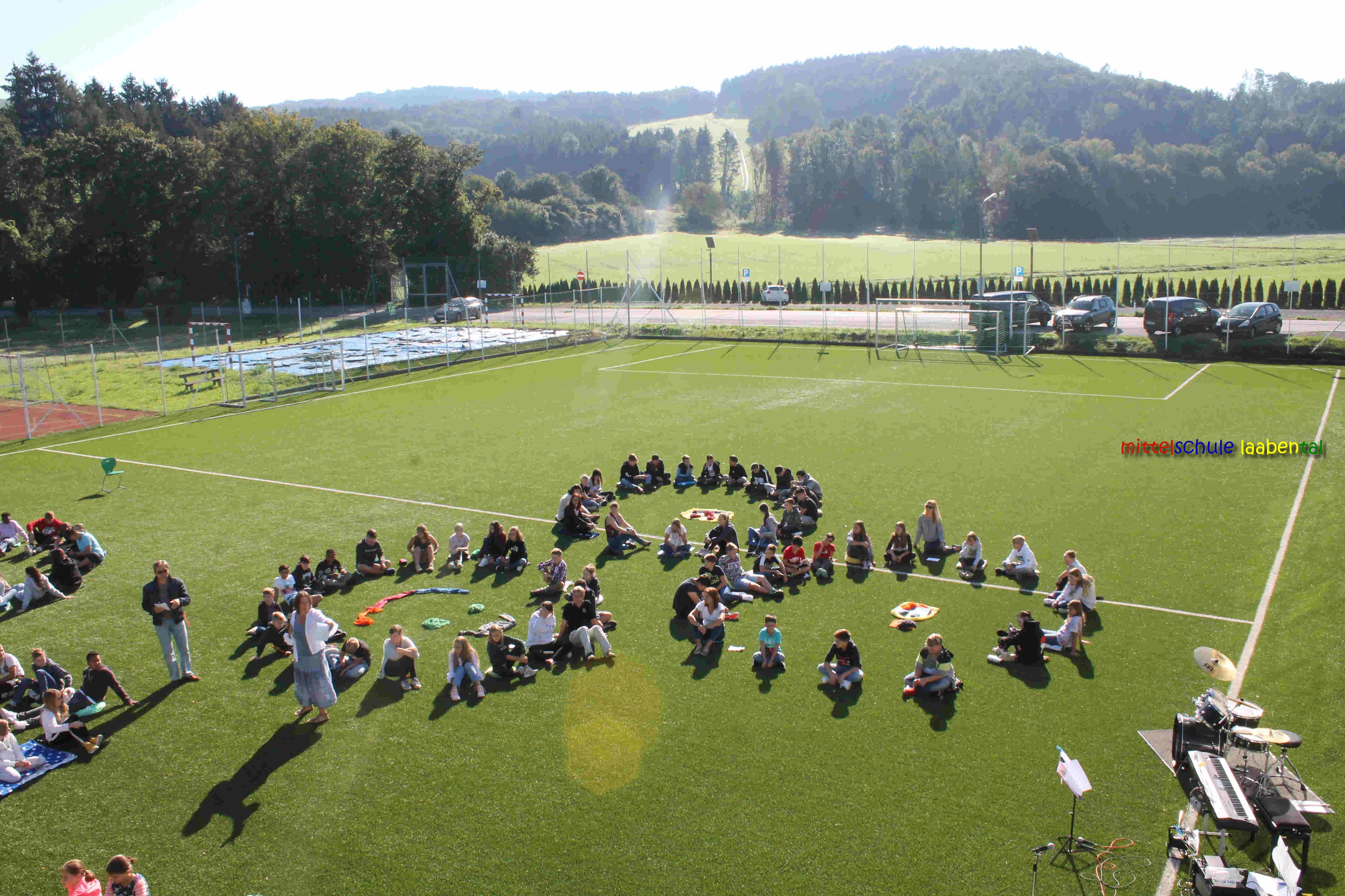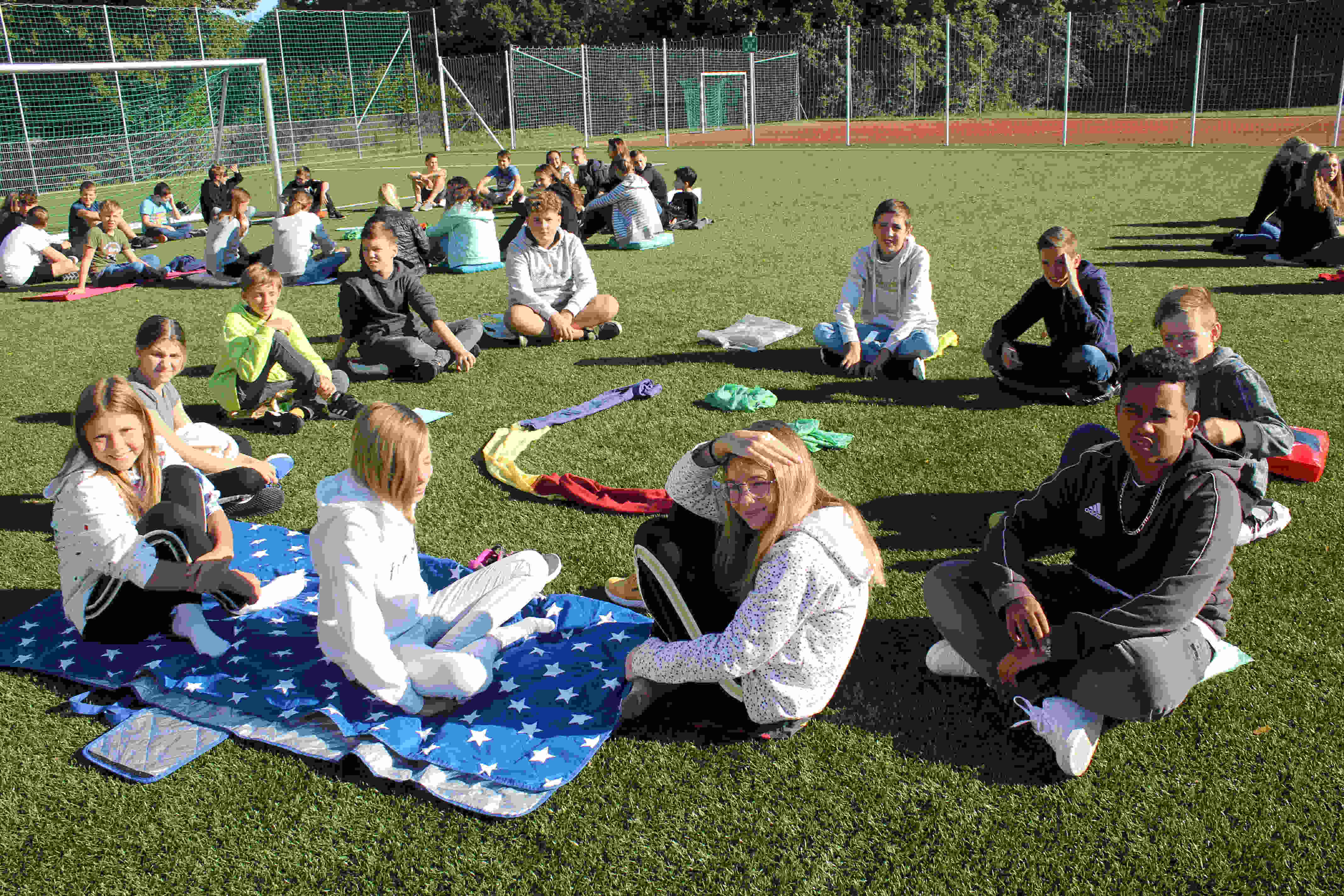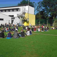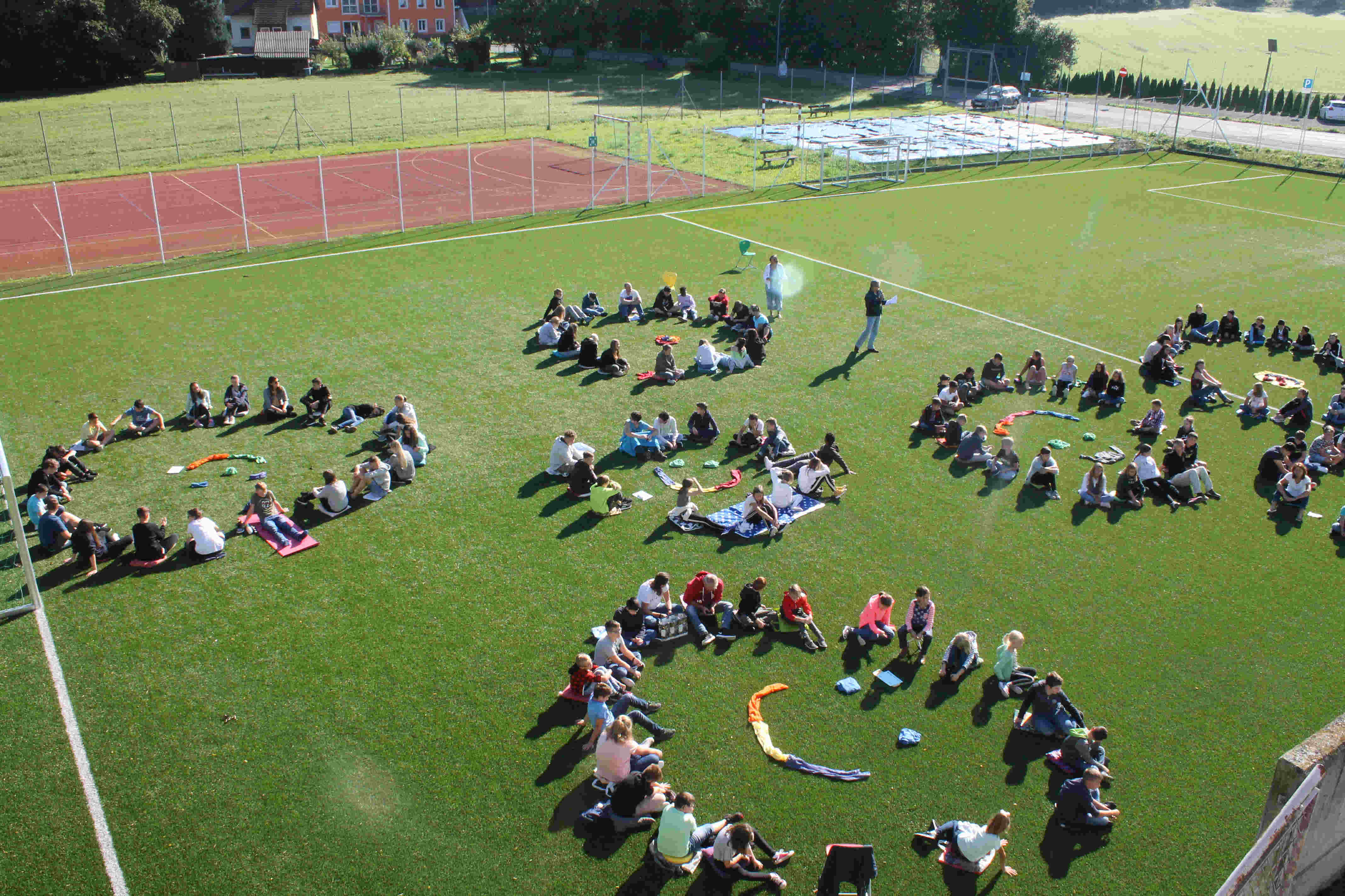 Auf unserem Sportplatz saßen wir klassenweise im Kreis und feierten gemeinsam den Schulbeginn.