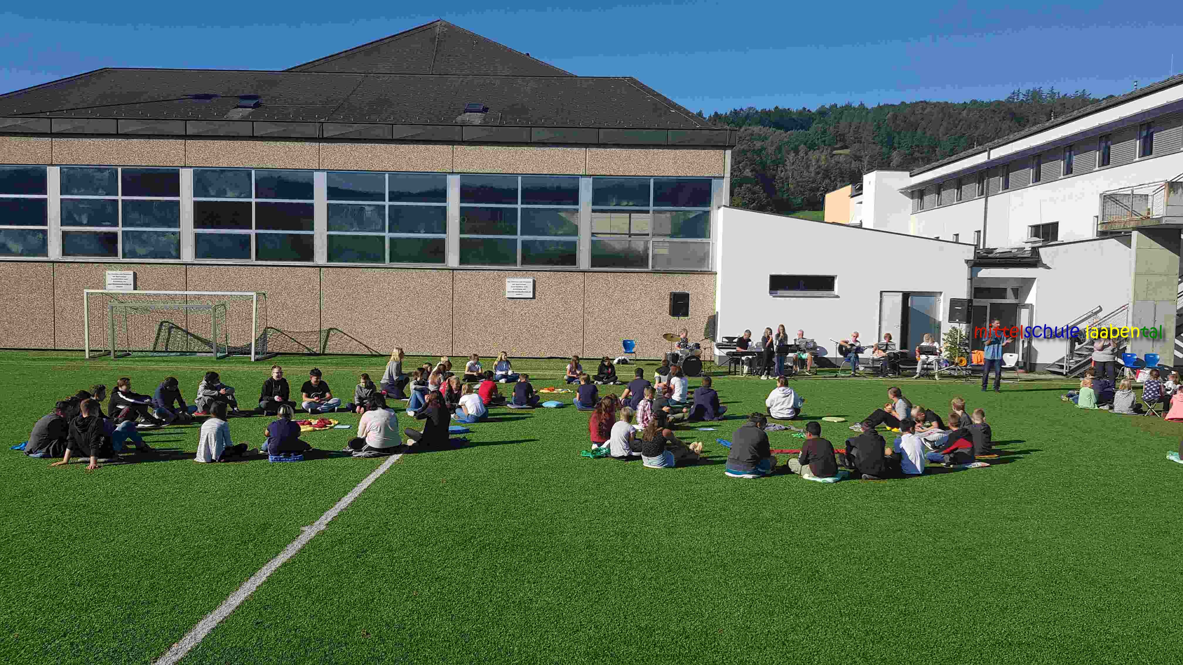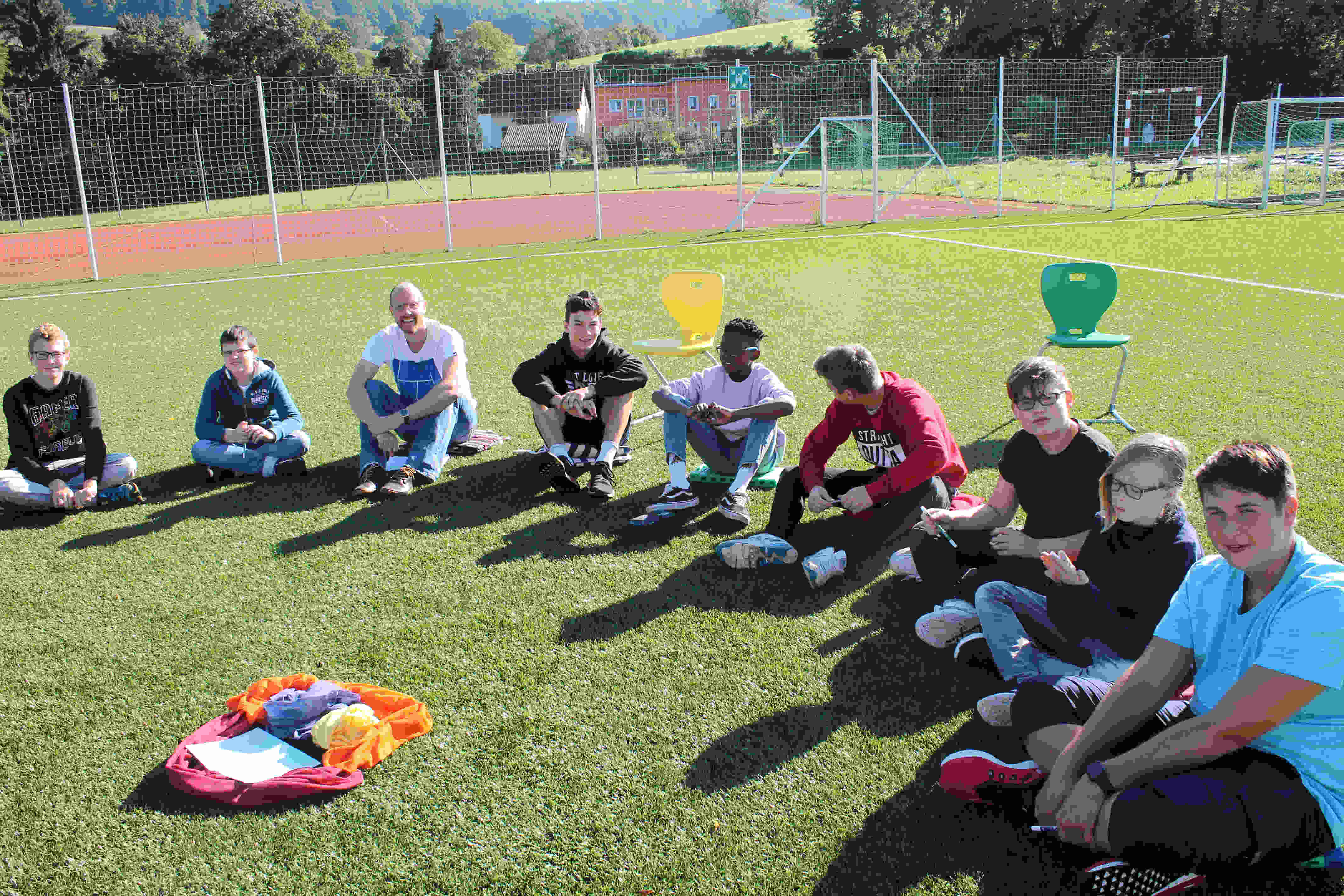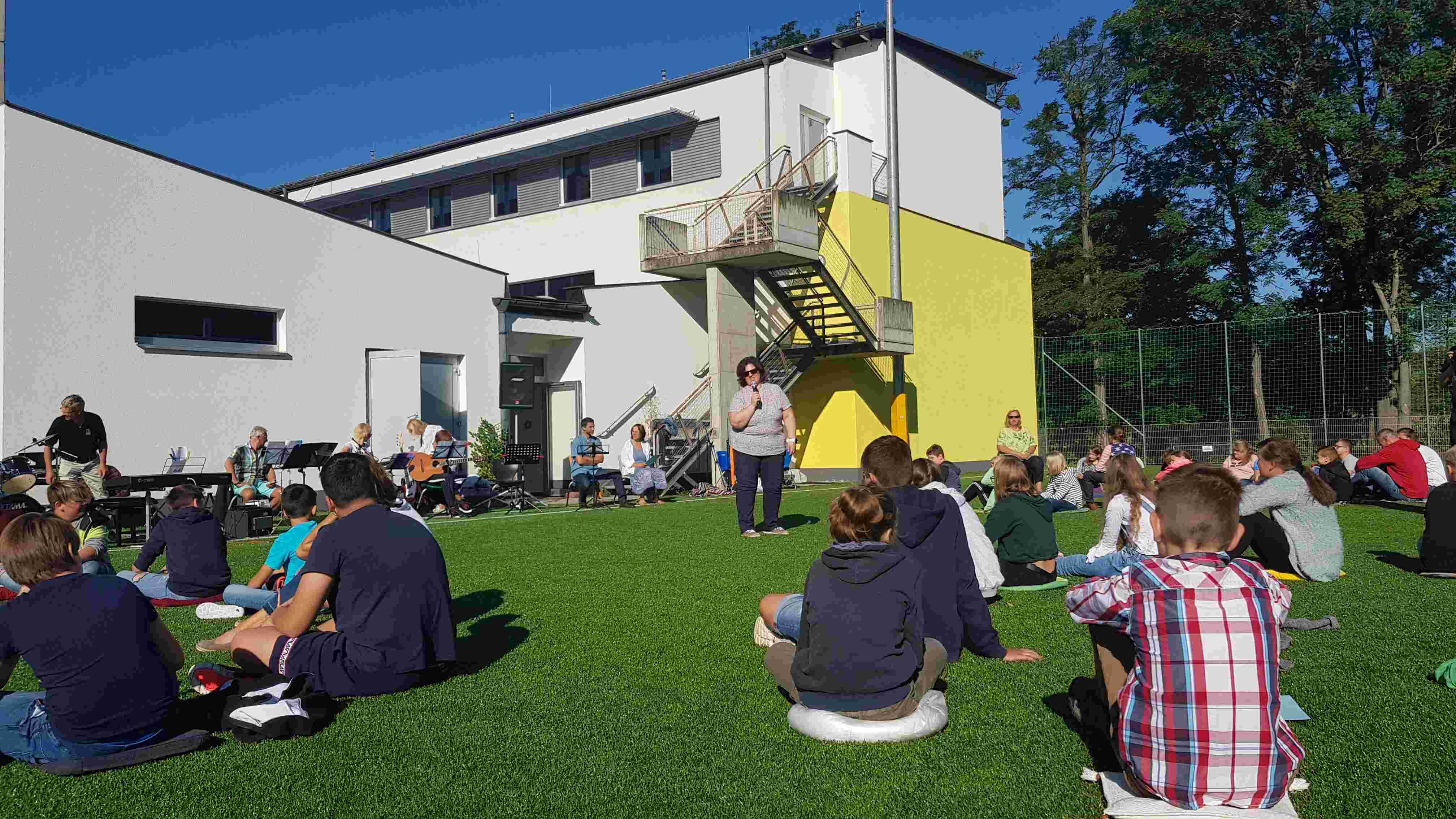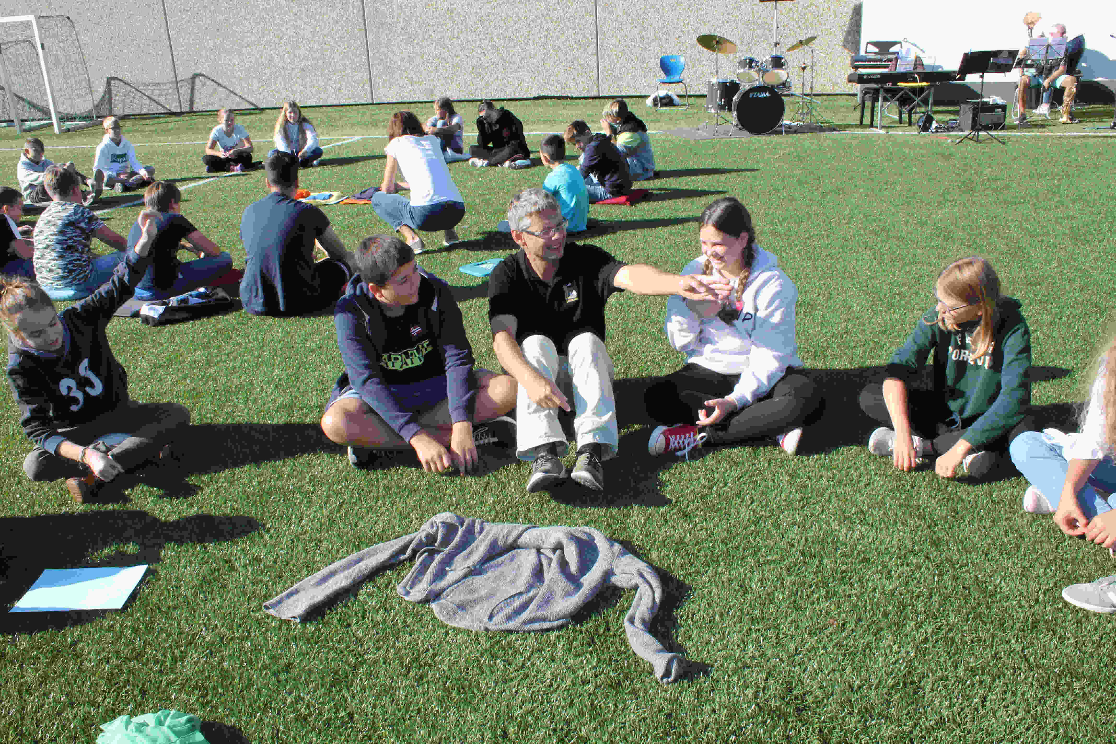 Auf unserem Sportplatz saßen wir klassenweise im Kreis und feierten gemeinsam den Schulbeginn.
