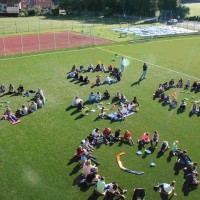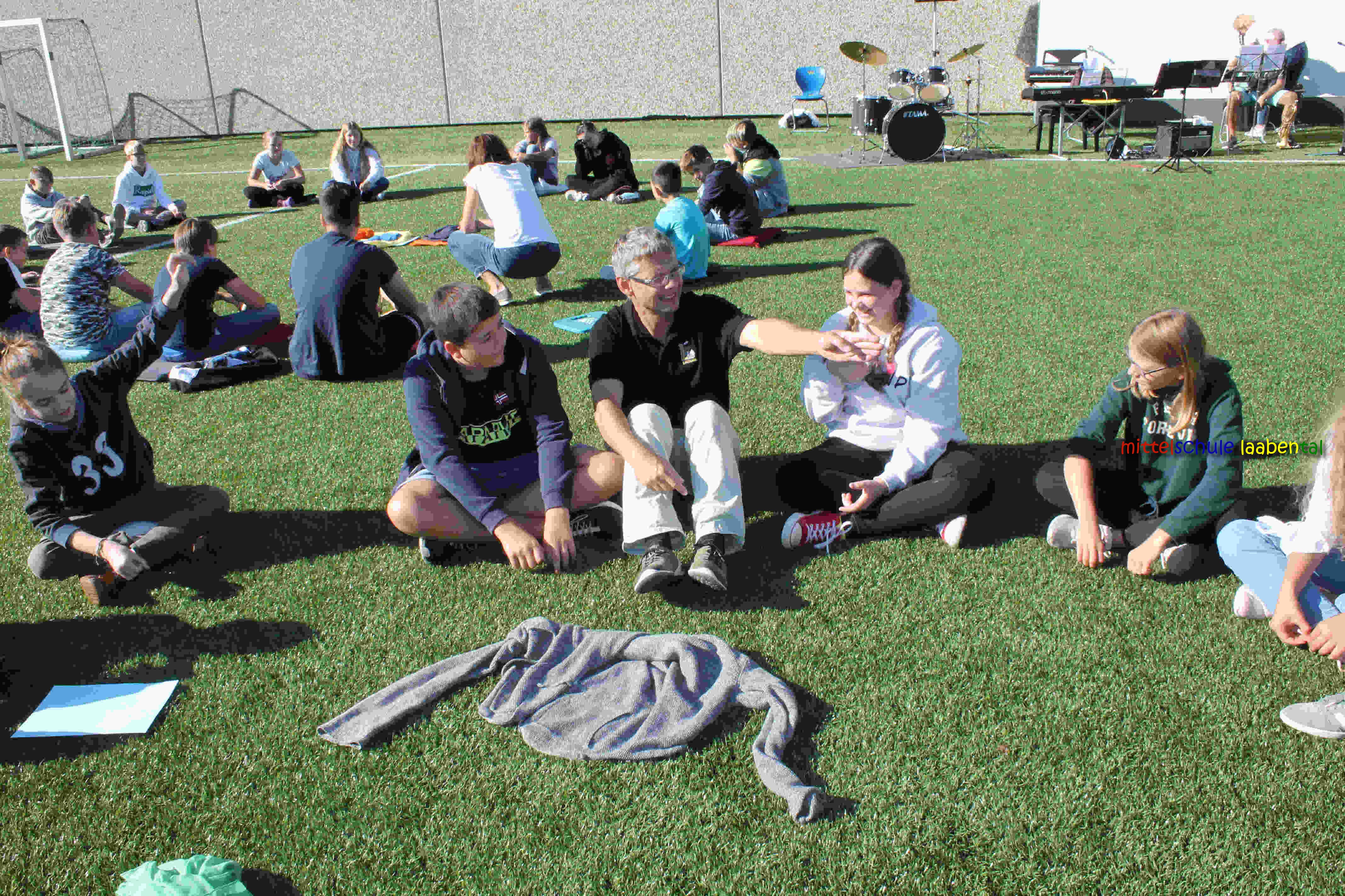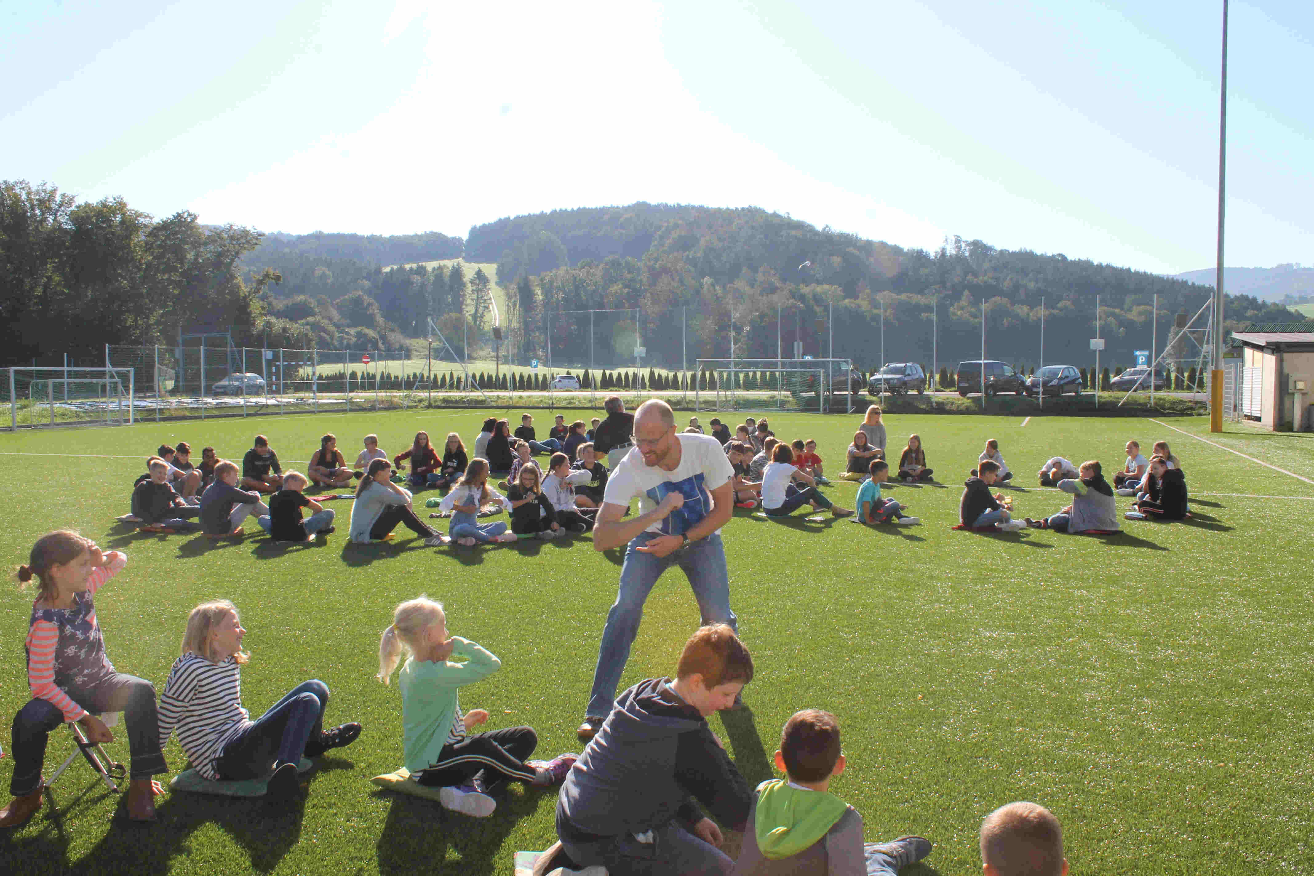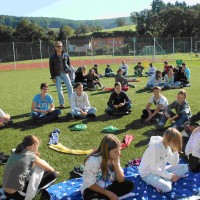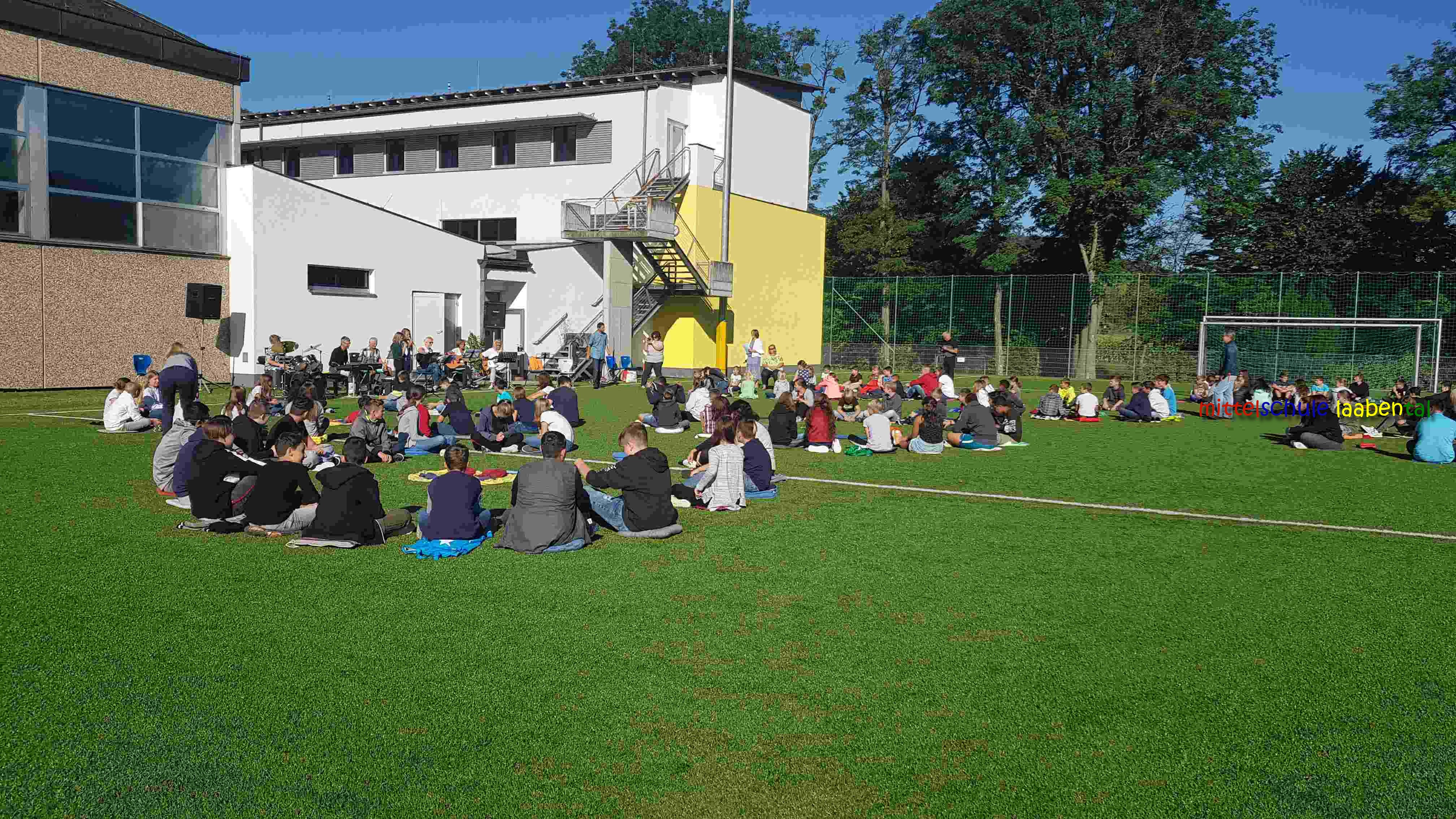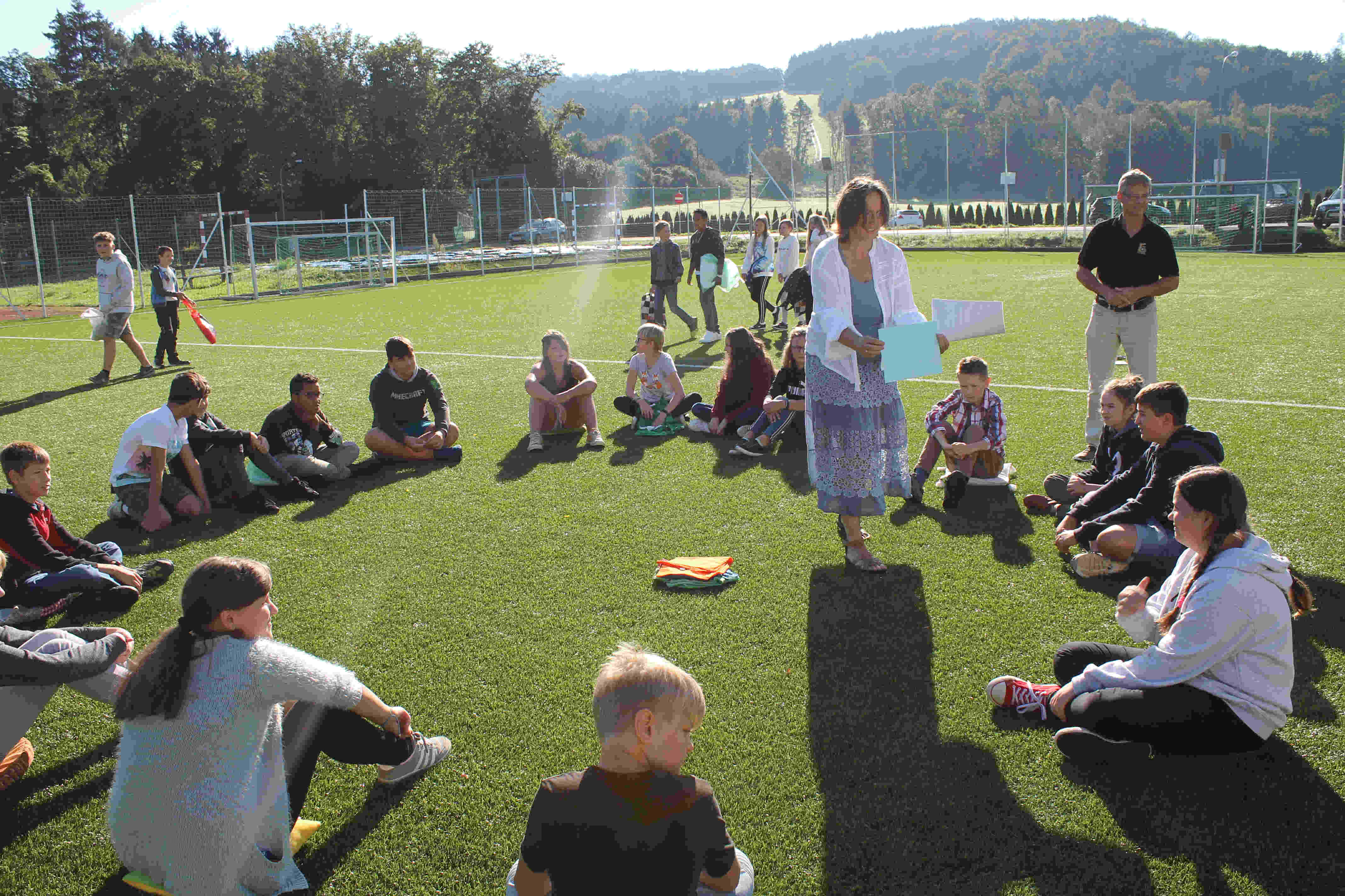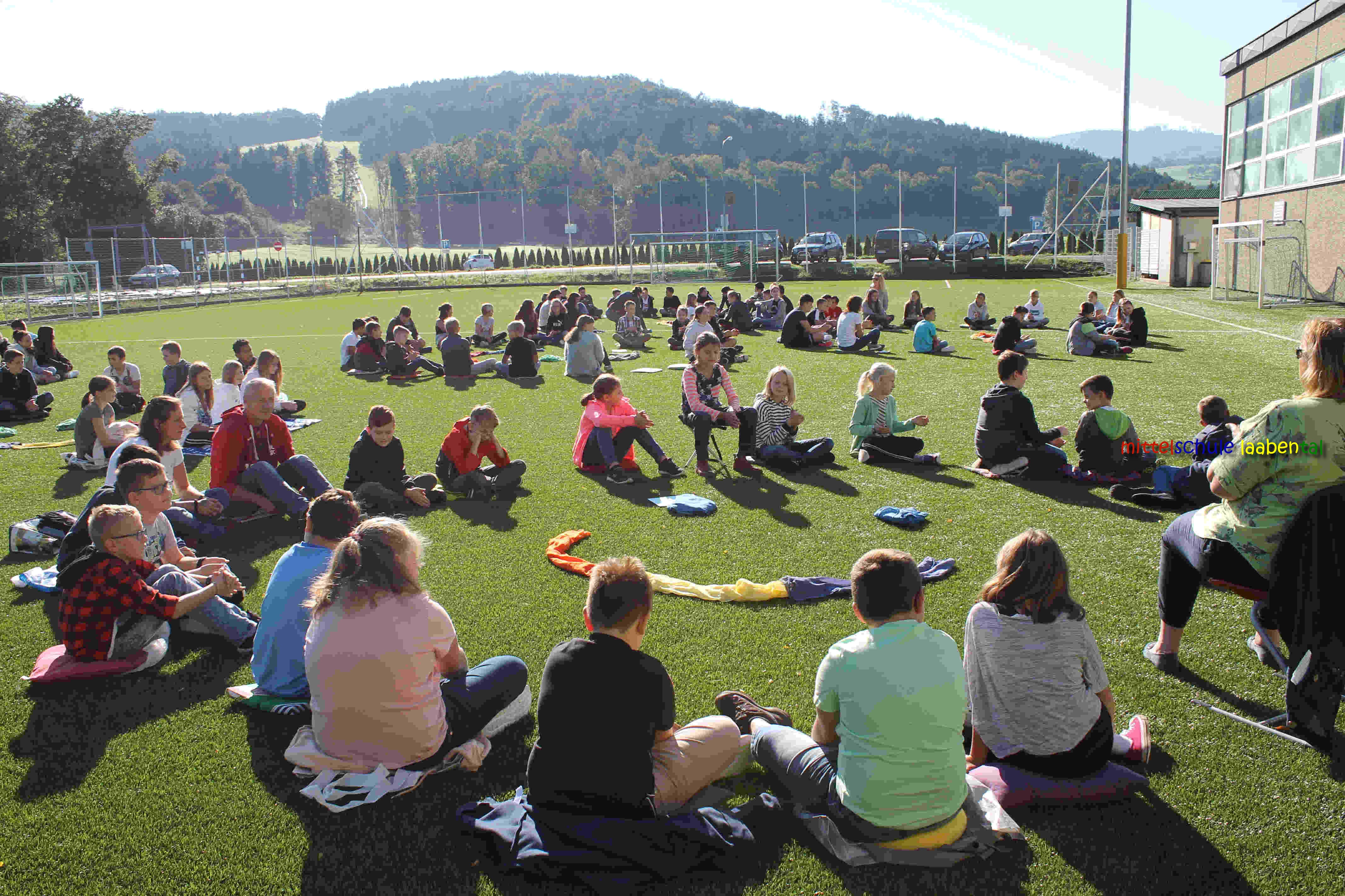 Auf unserem Sportplatz saßen wir klassenweise im Kreis und feierten gemeinsam den Schulbeginn.