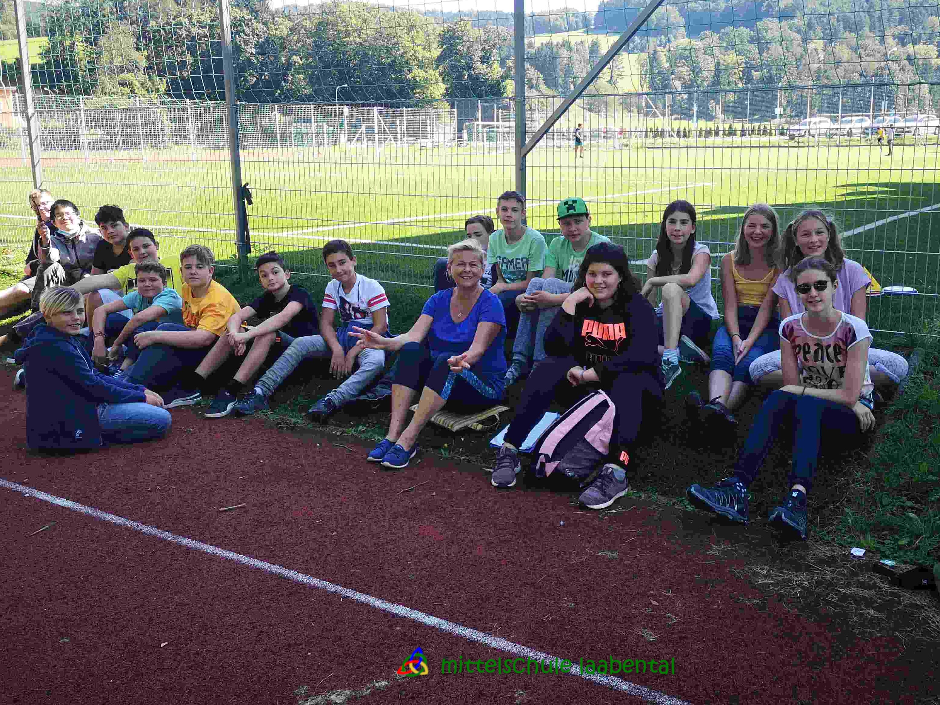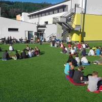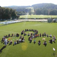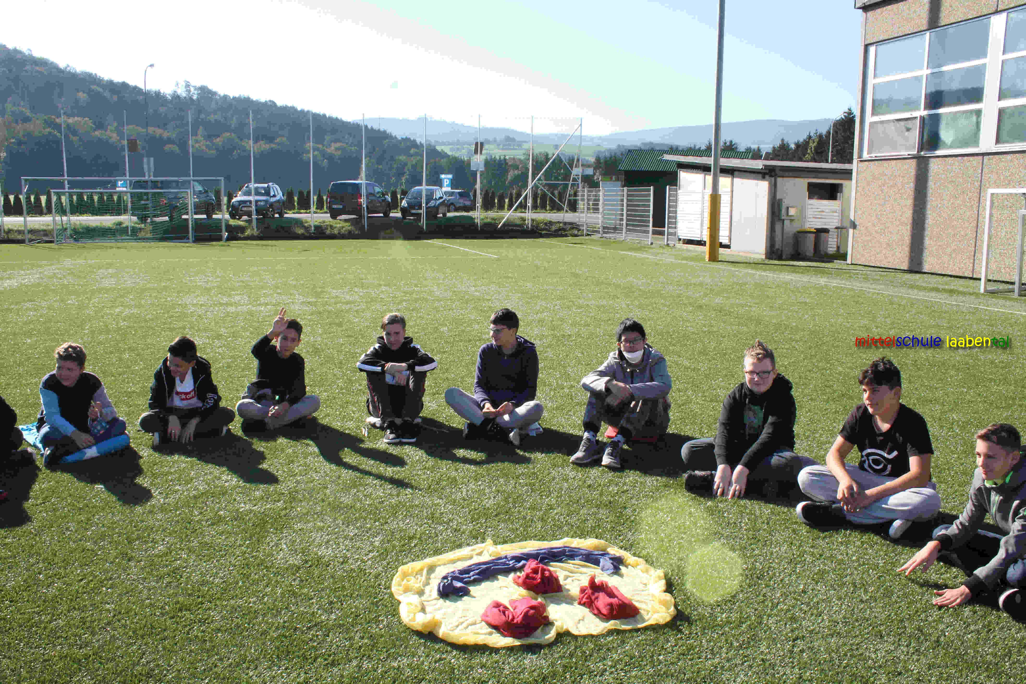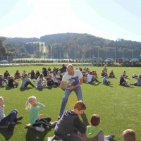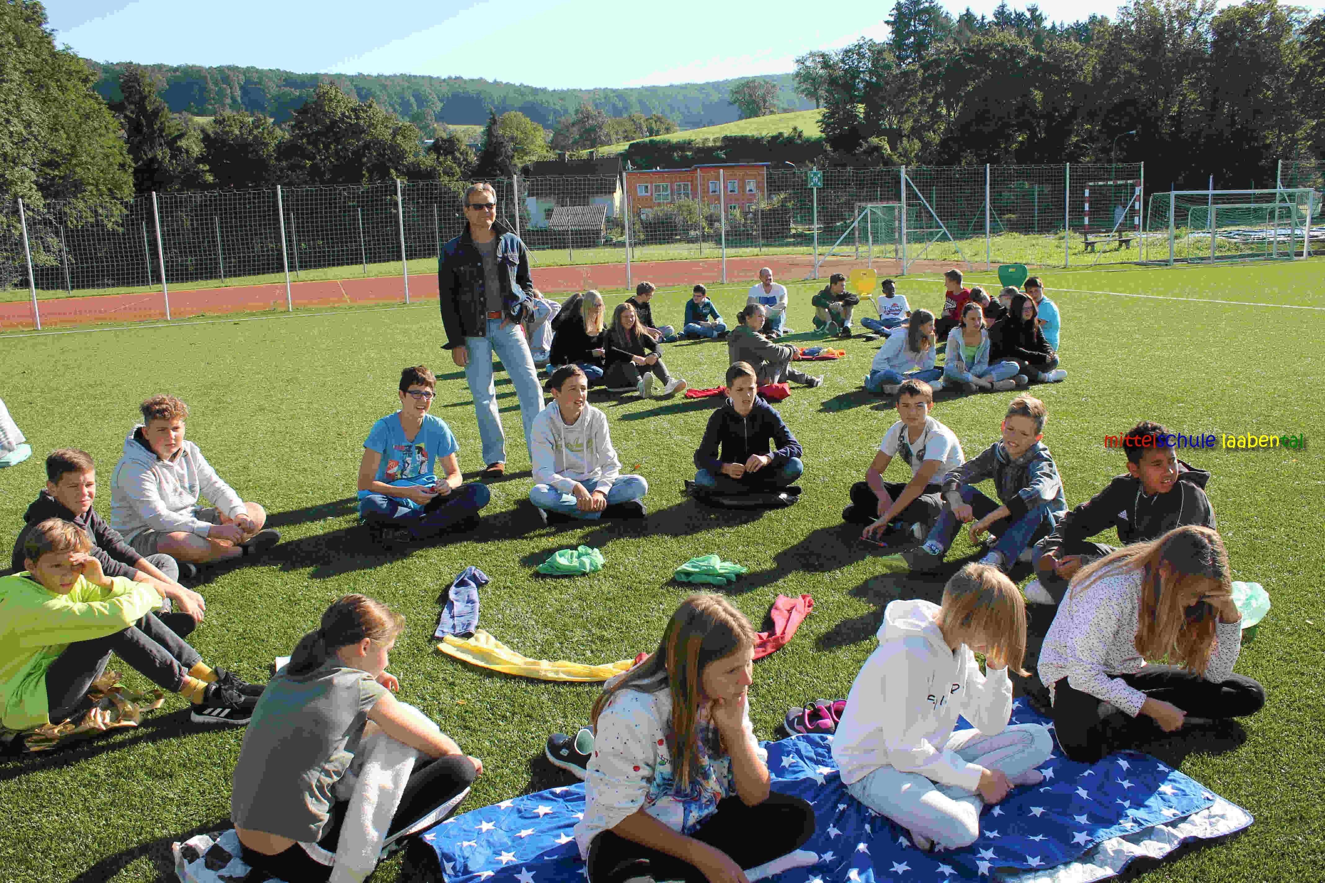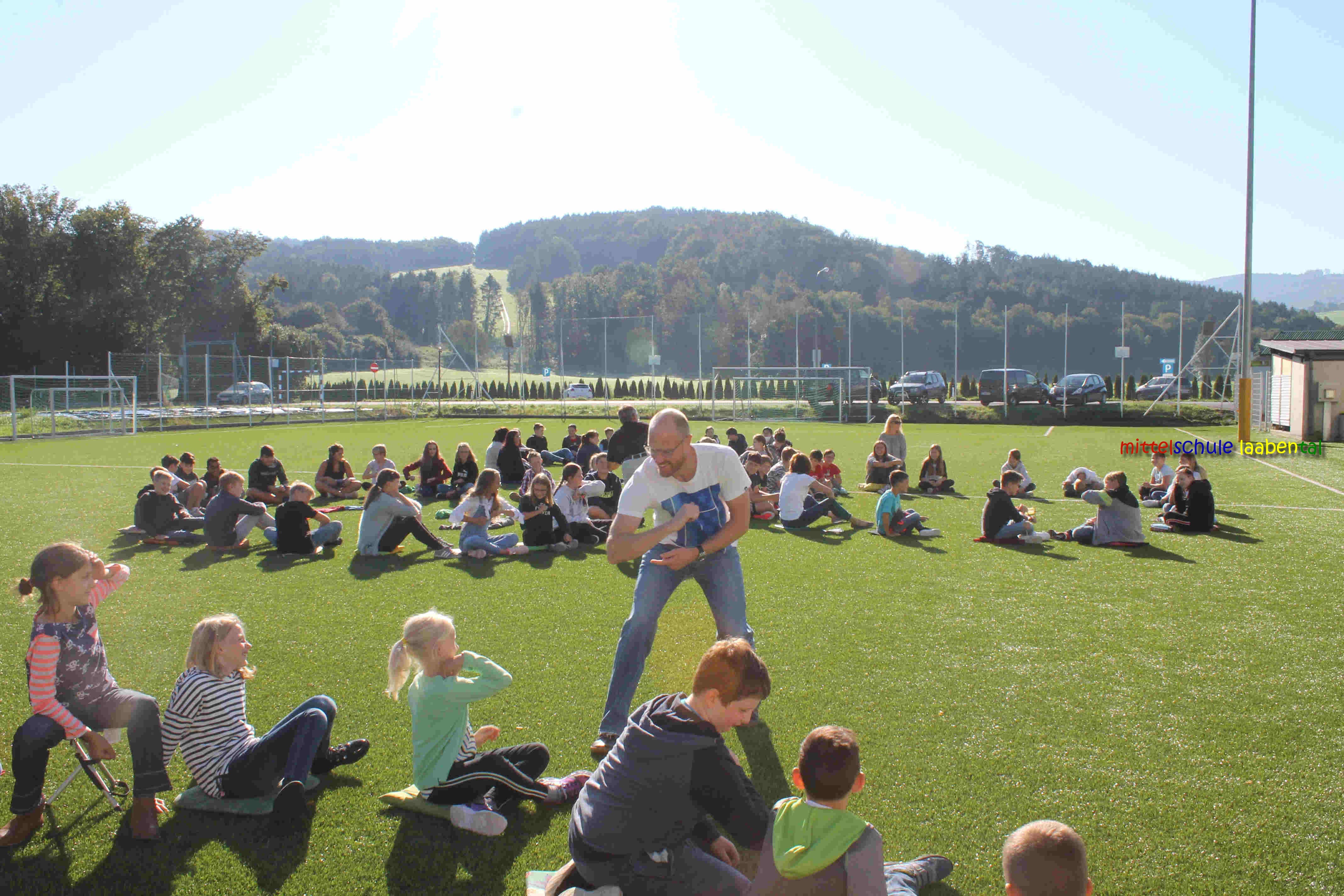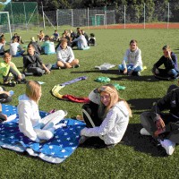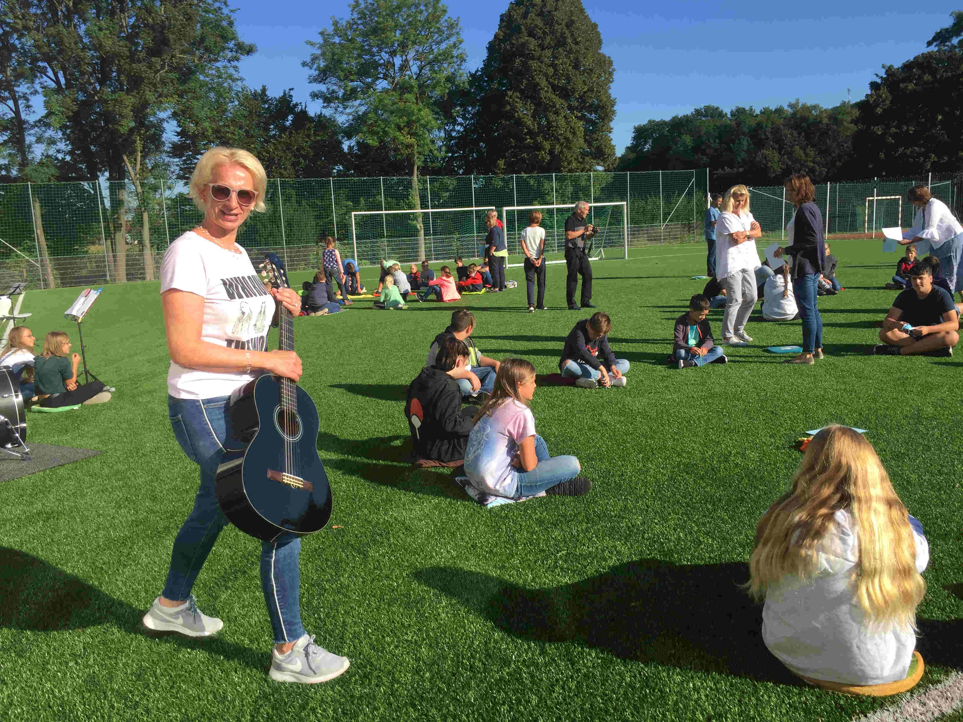 Auf unserem Sportplatz saßen wir klassenweise im Kreis und feierten gemeinsam den Schulbeginn.