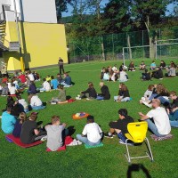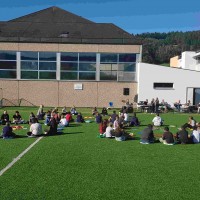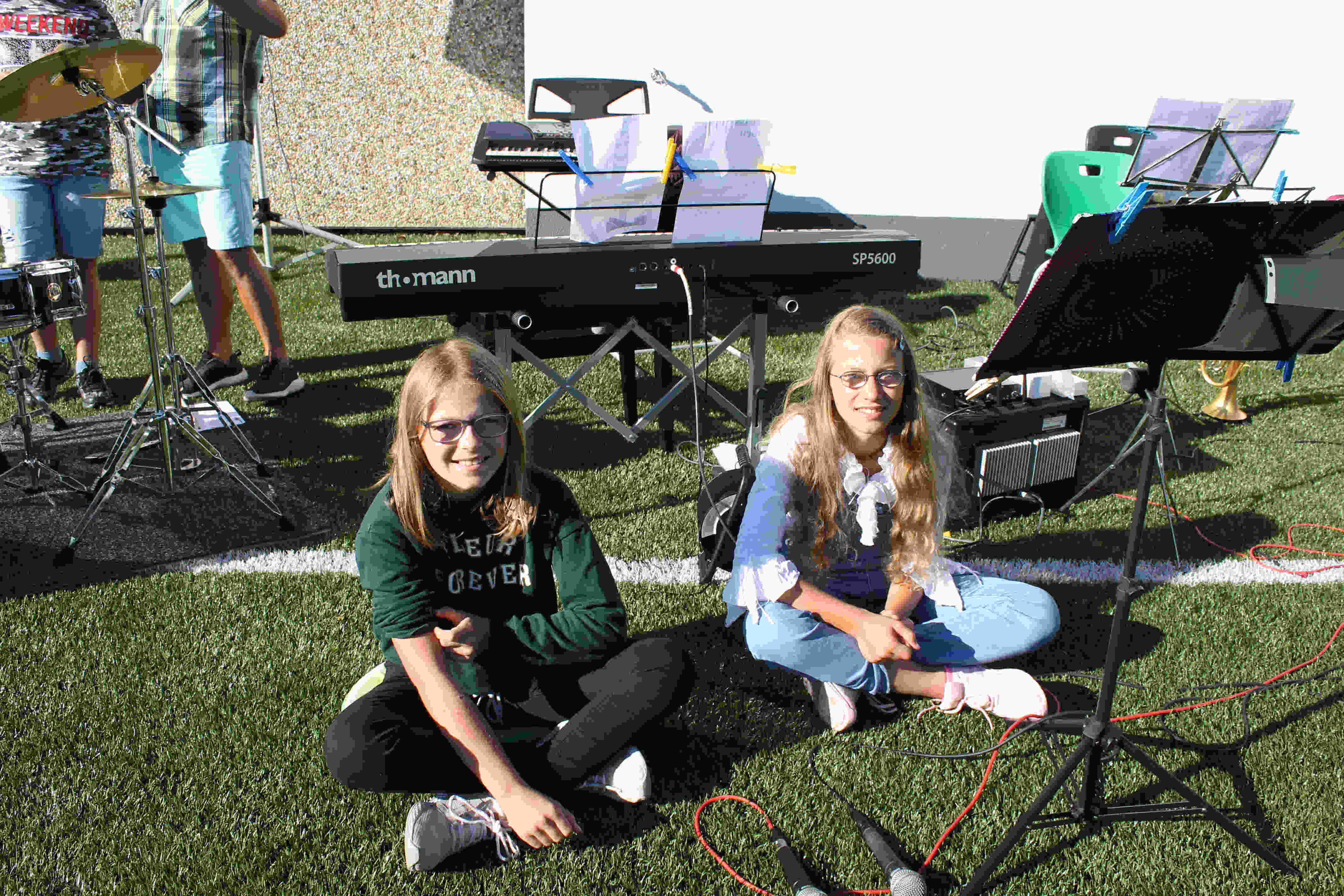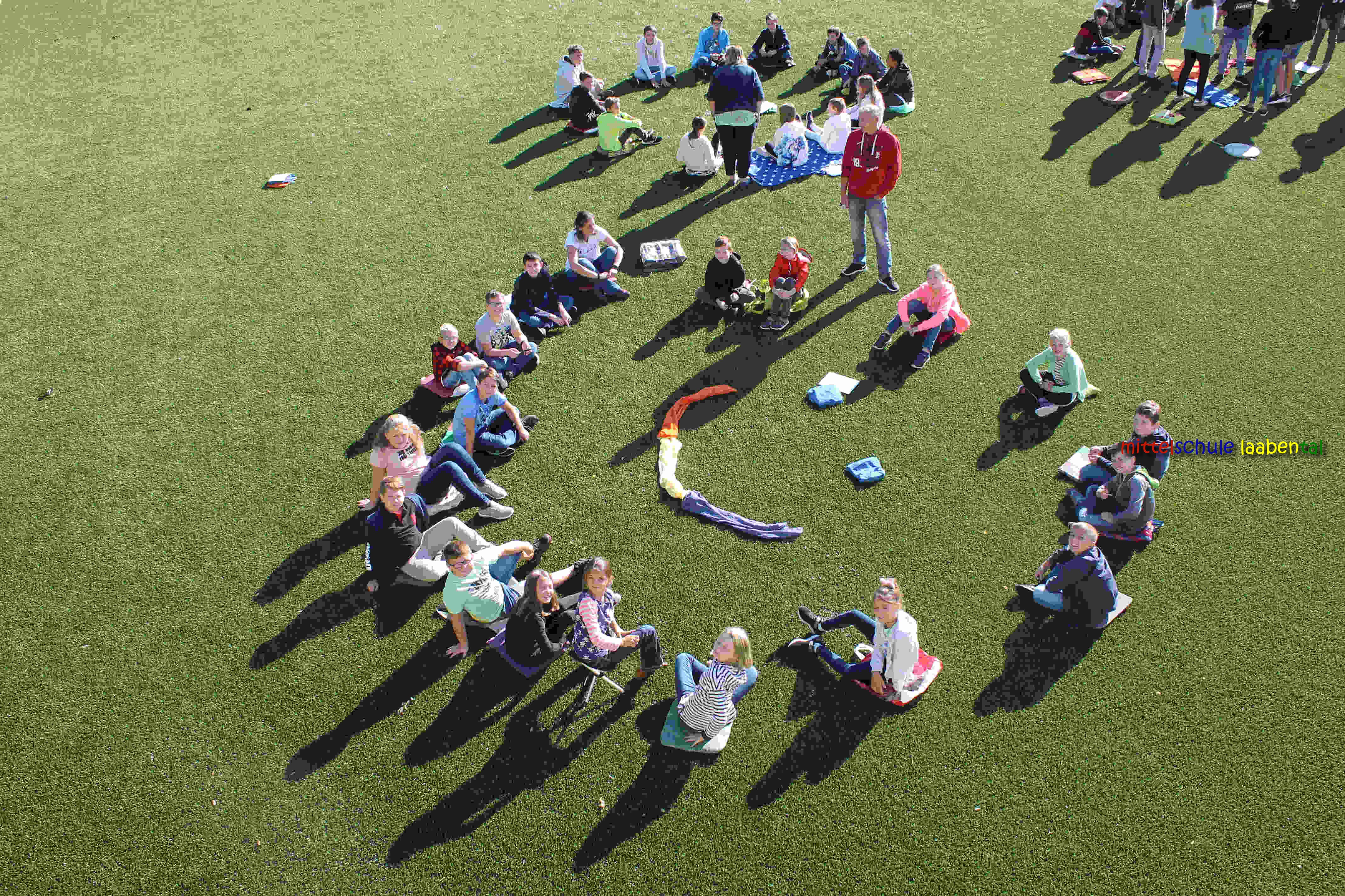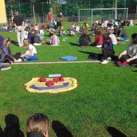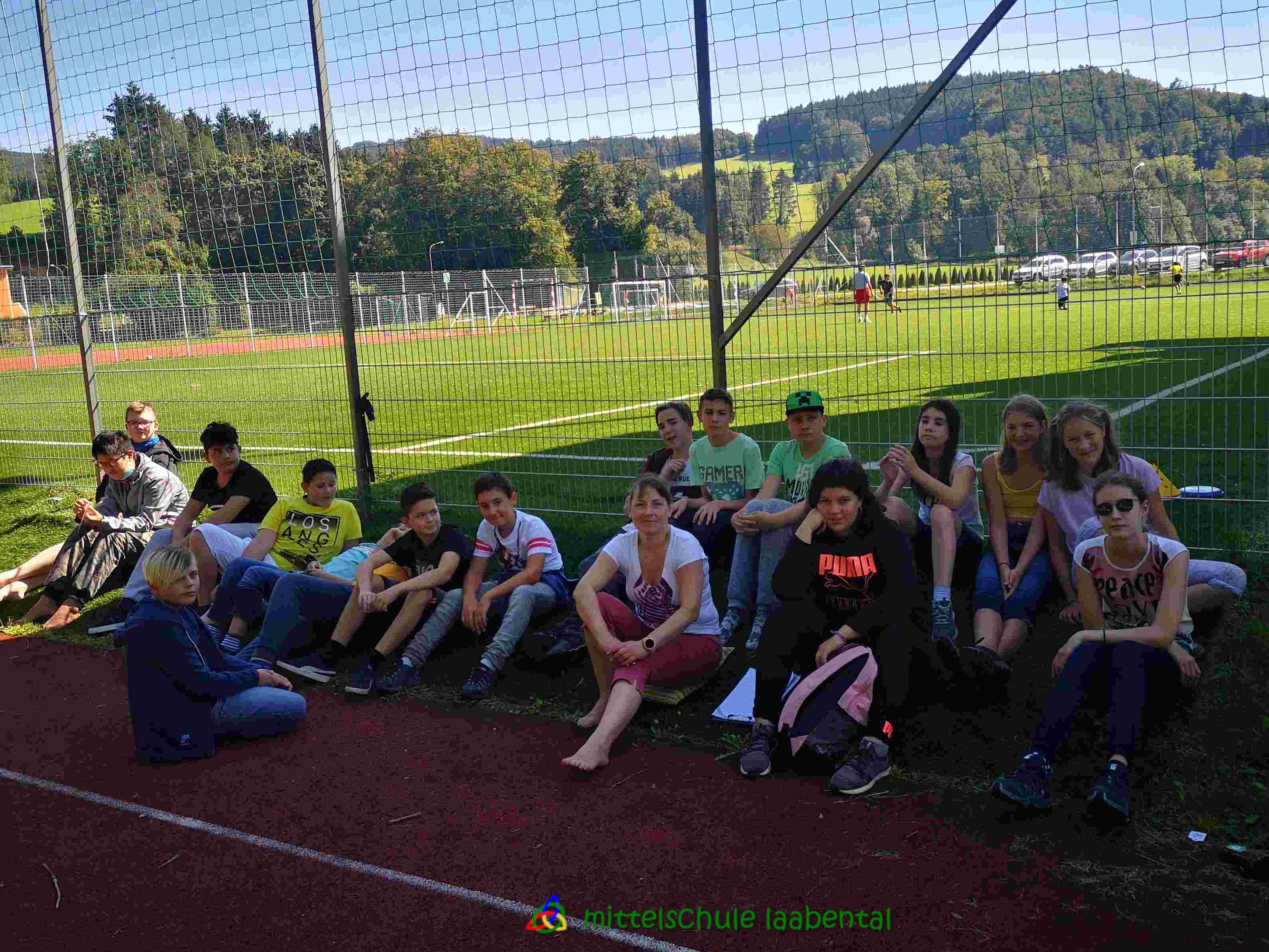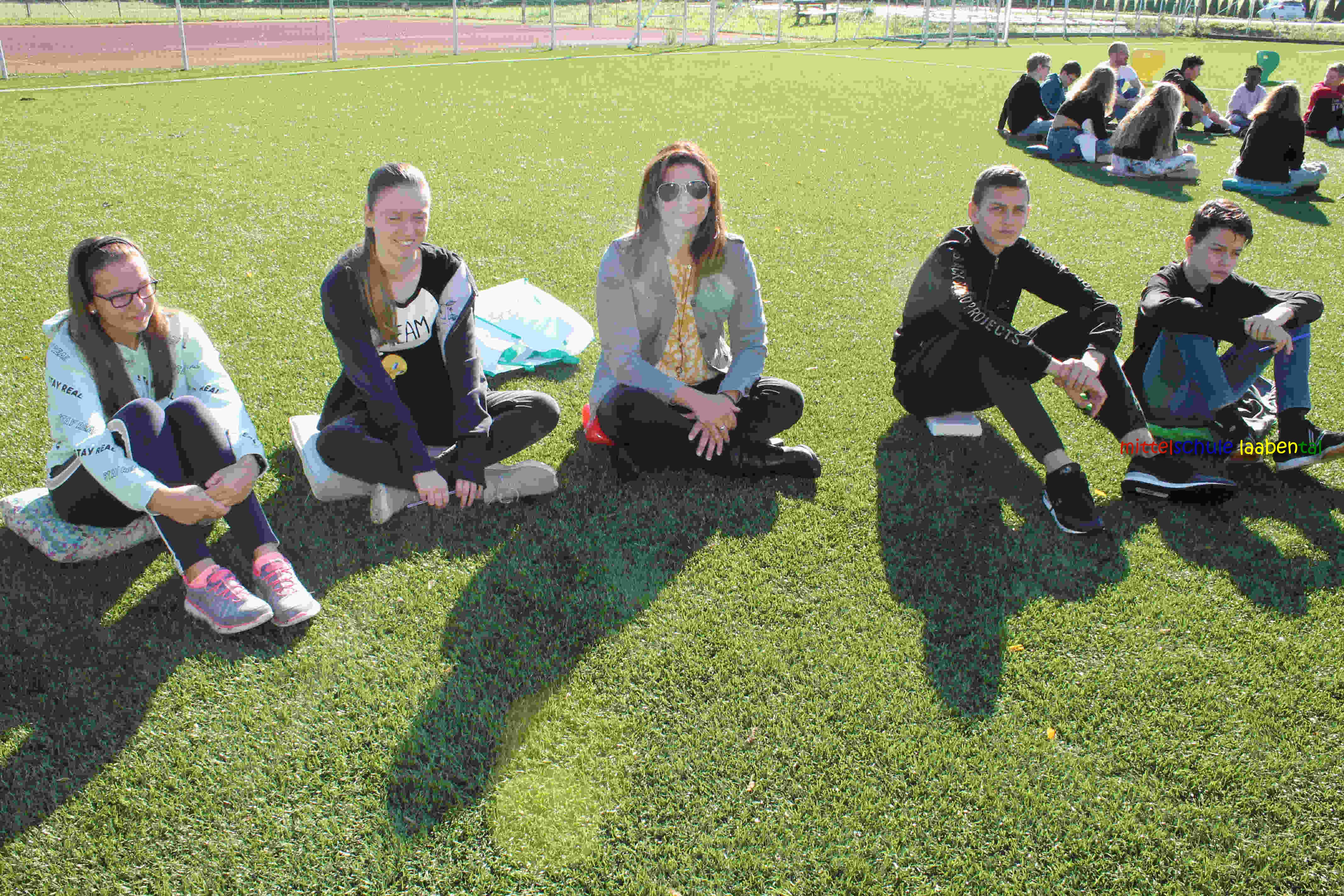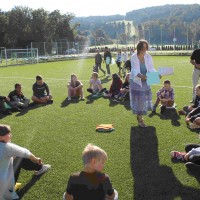 Auf unserem Sportplatz saßen wir klassenweise im Kreis und feierten gemeinsam den Schulbeginn.