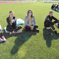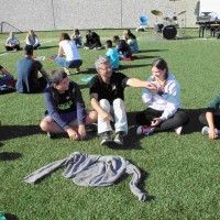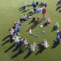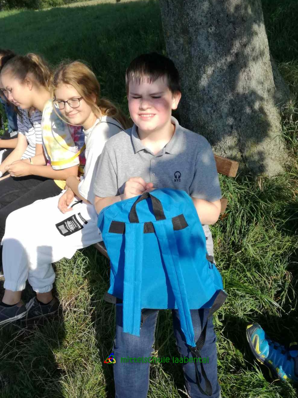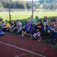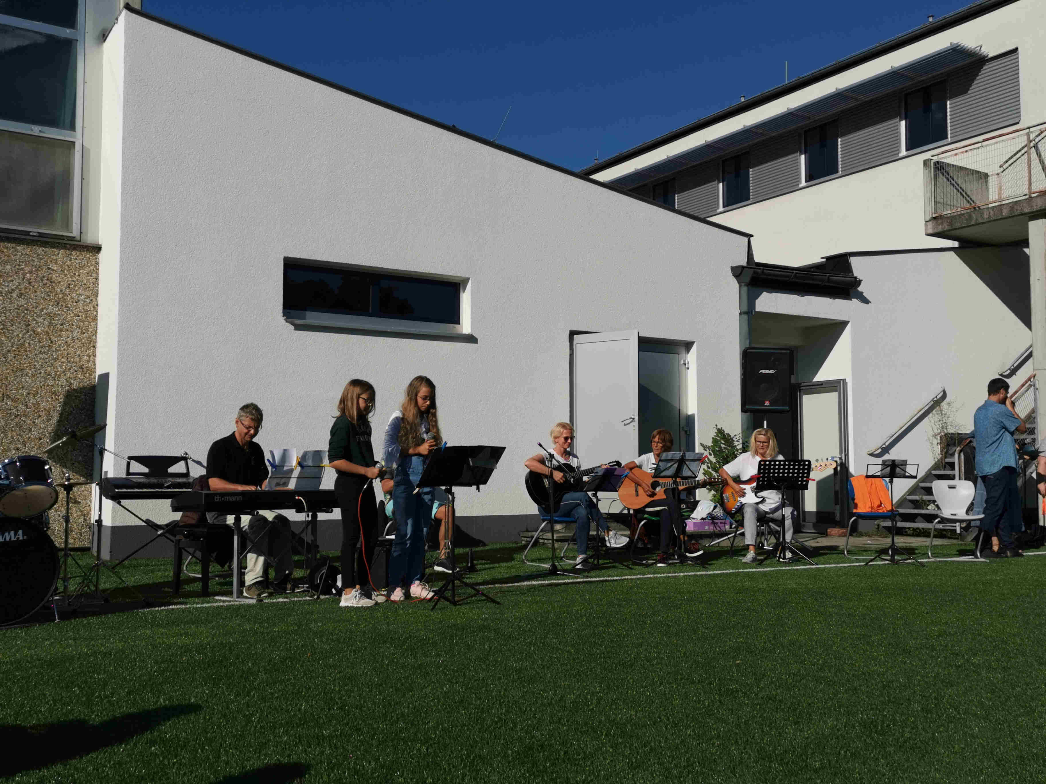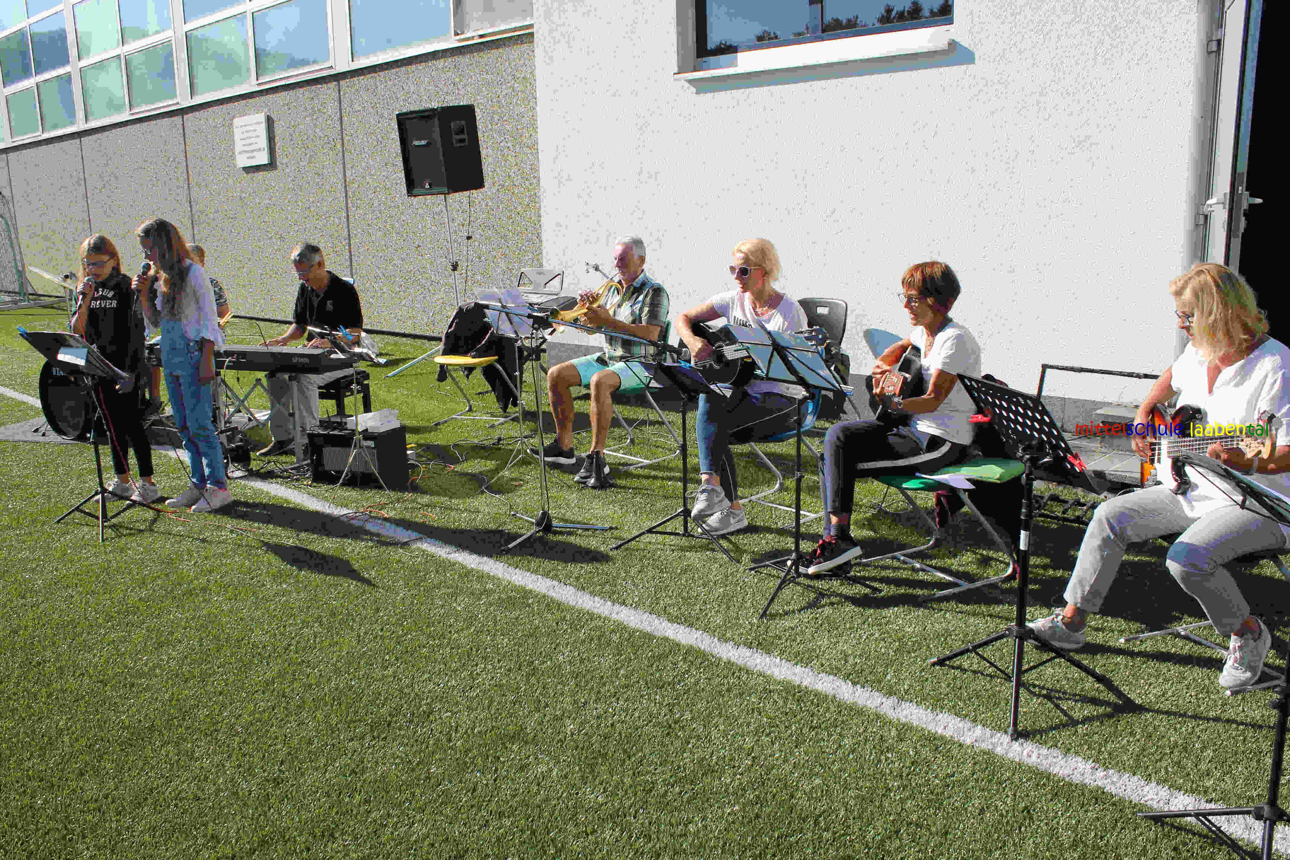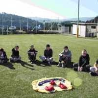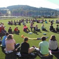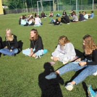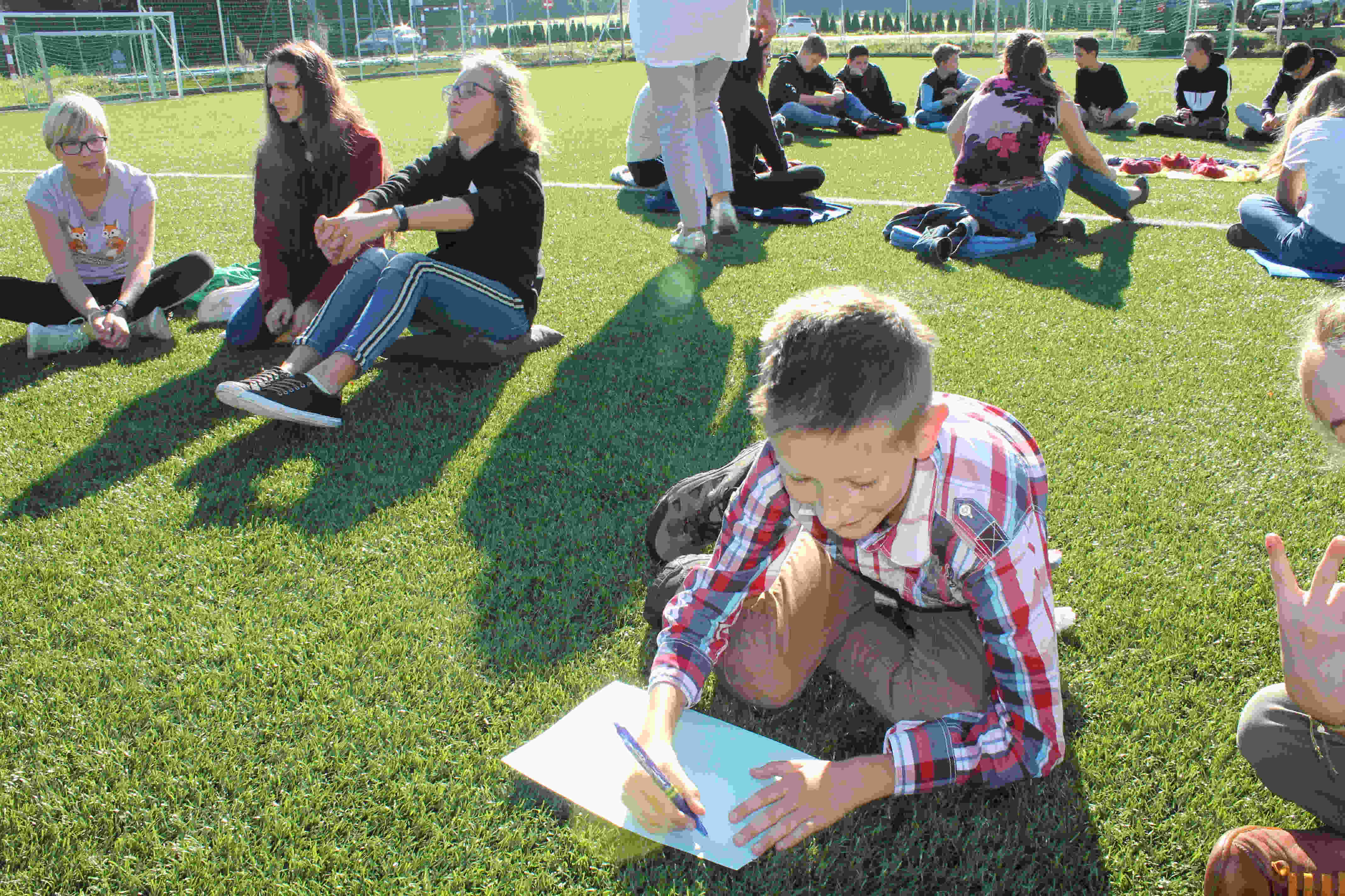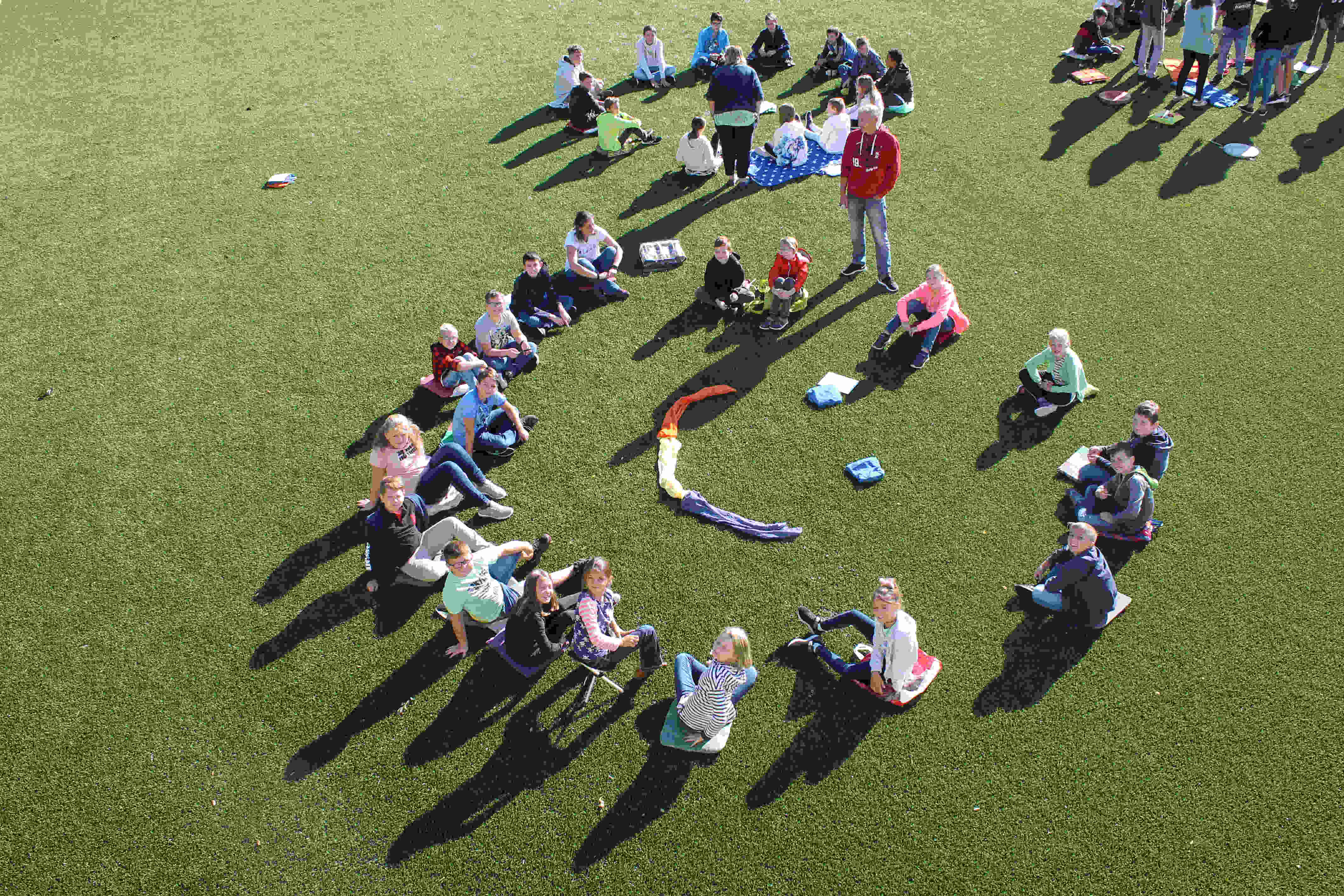 Auf unserem Sportplatz saßen wir klassenweise im Kreis und feierten gemeinsam den Schulbeginn.