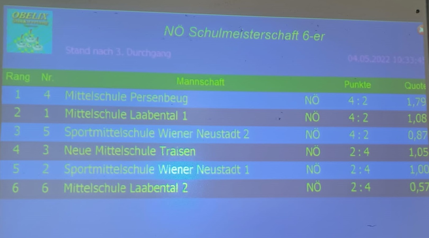 Zum ersten Mal nahmen zwei Mannschaften der Mittelschule an der Schülermeisterschaft im Stockschießen in St.Pölten teil. Das Team 'Laabental 2" belegte den hervorragenden 4. Platz, "Laabental 1" gewann den Bewerb, ist somit neuer Landesmeister.