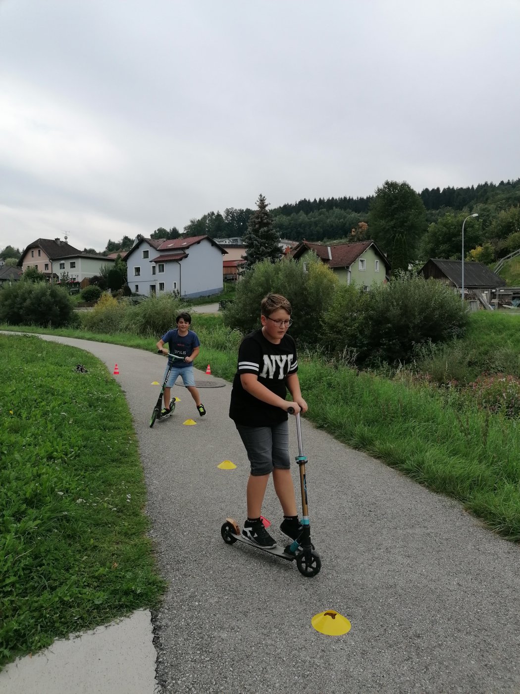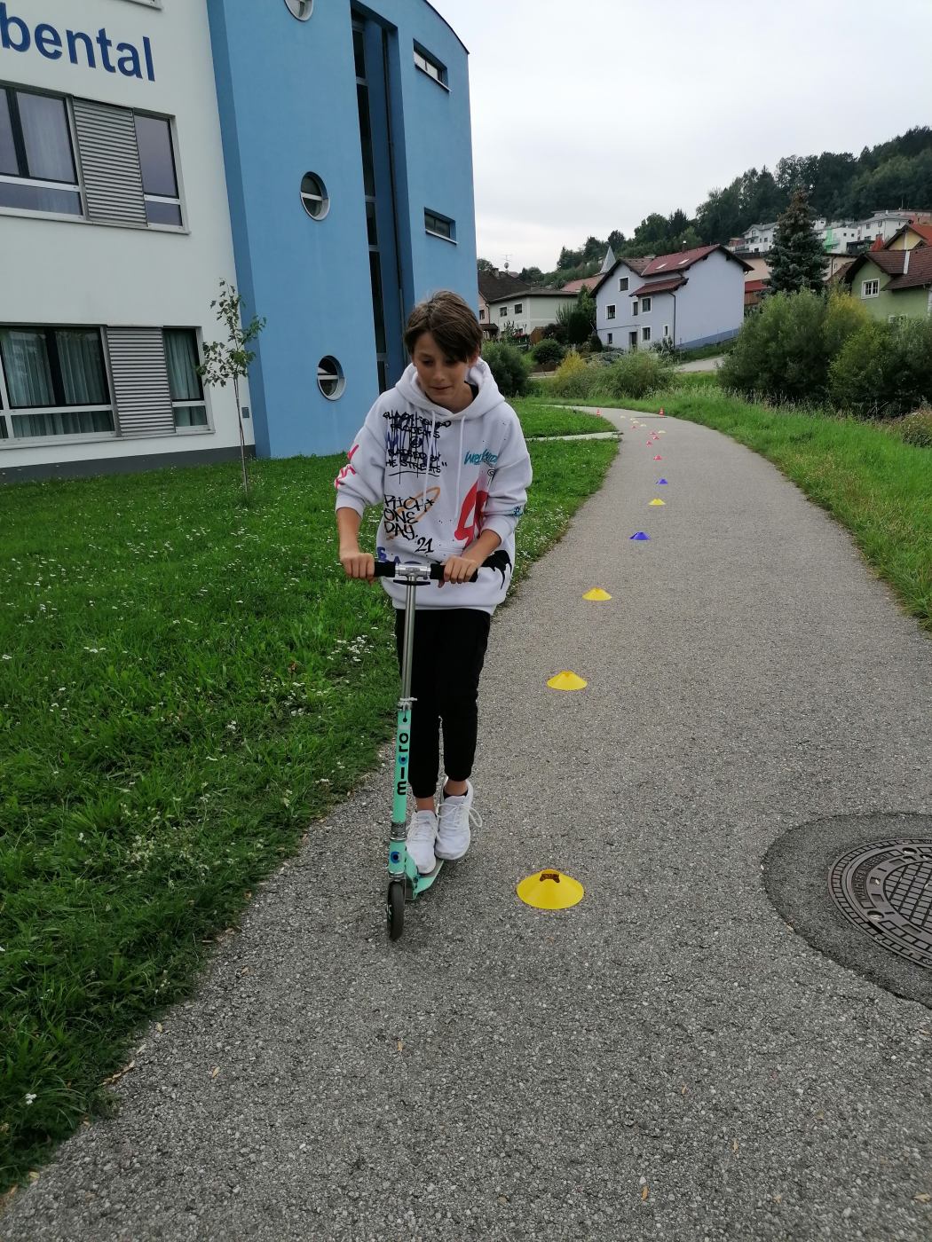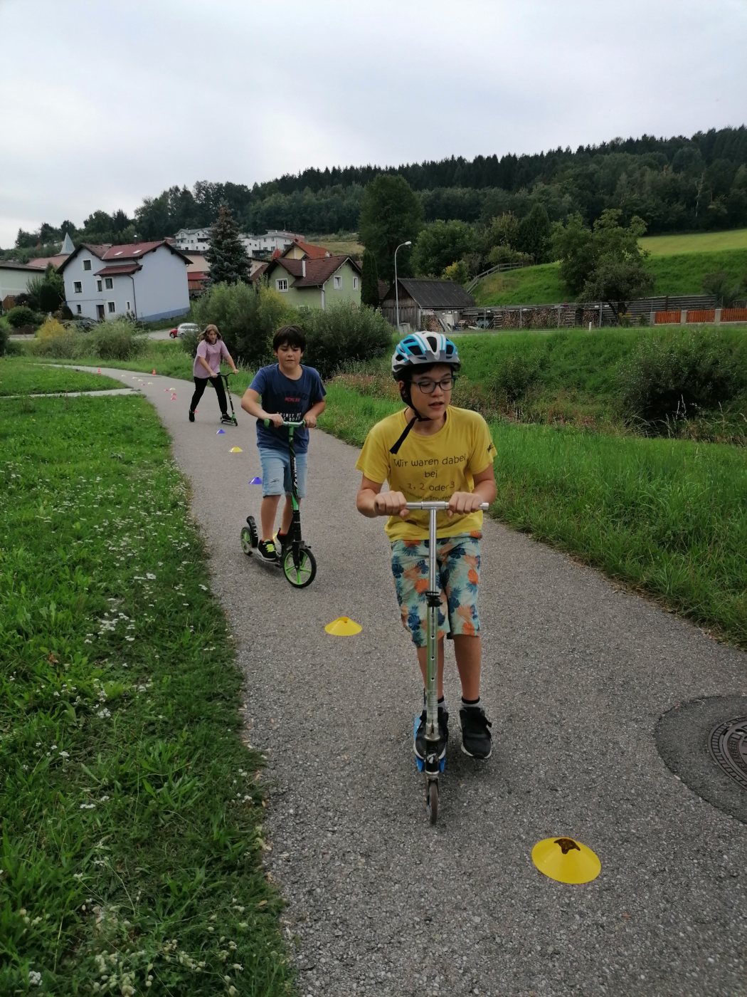 Die Schülerinnen und Schüler der 3a machten in der ersten Schulwoche ein Geschicklichkeitstraining mit ihren Rollern.