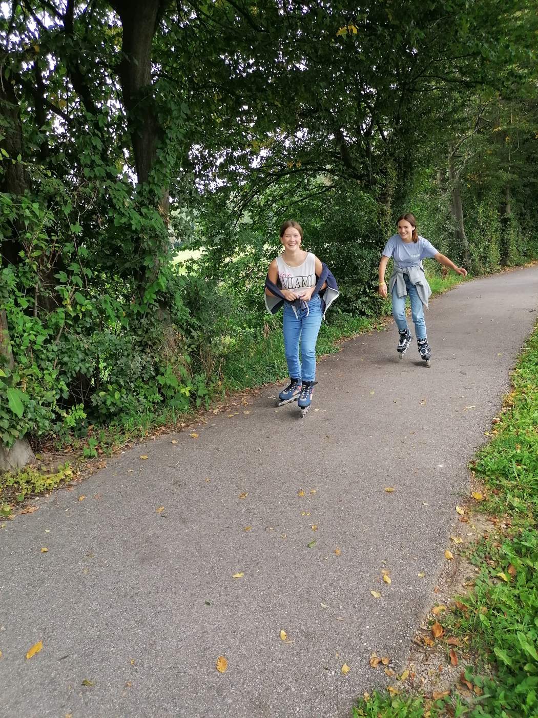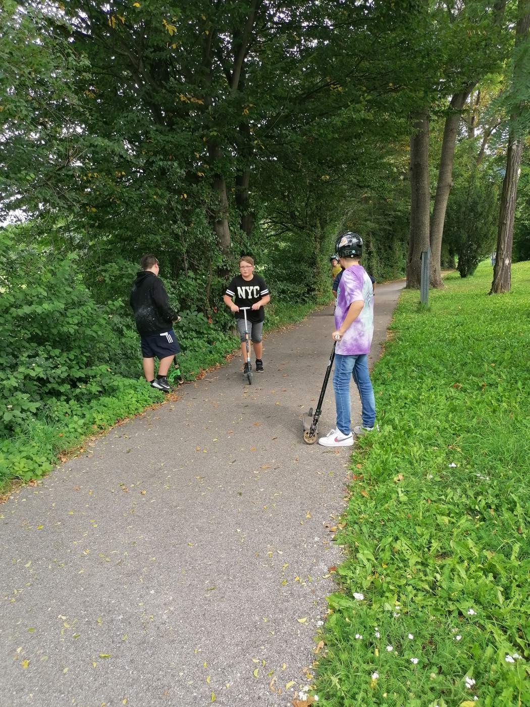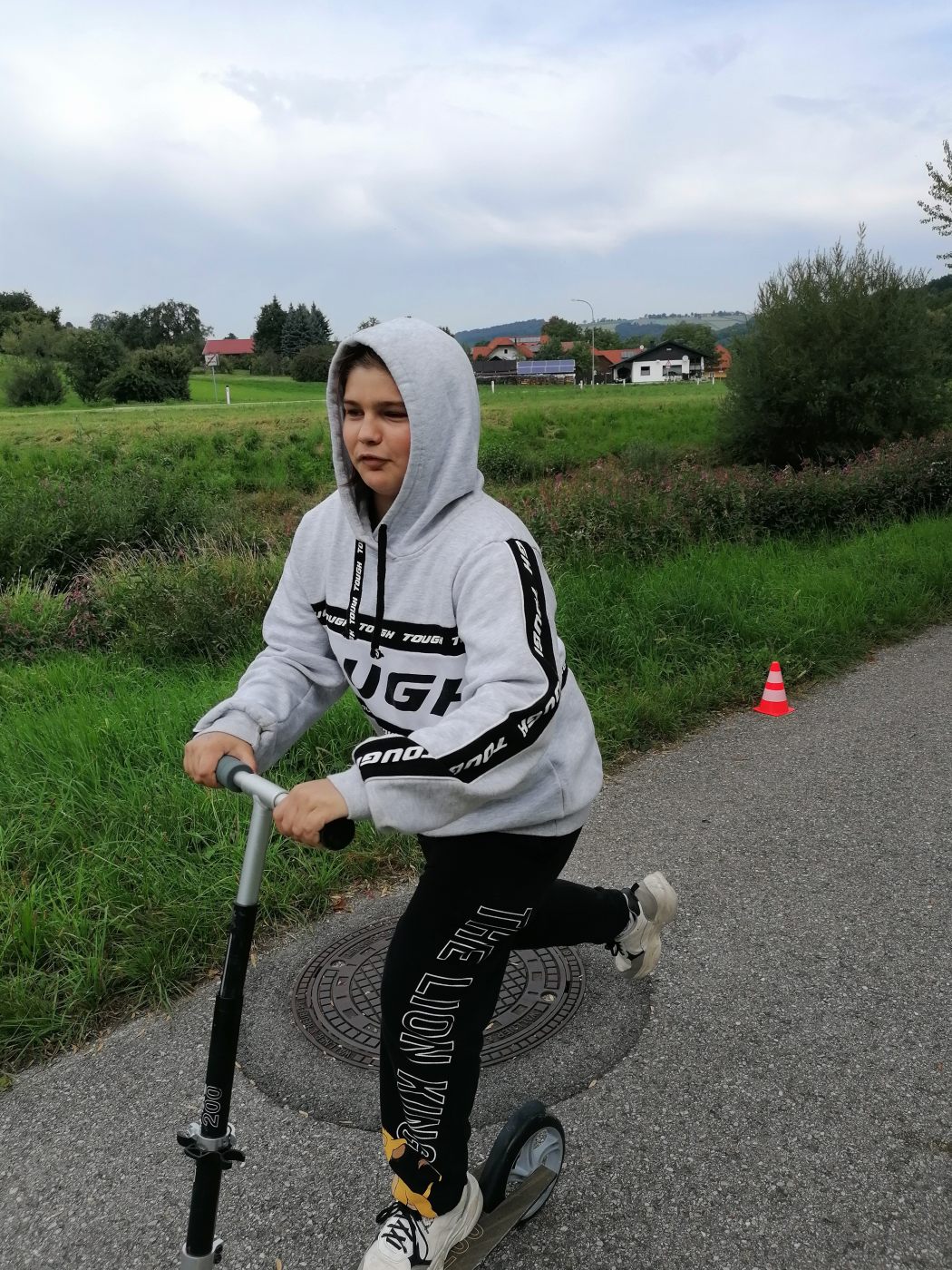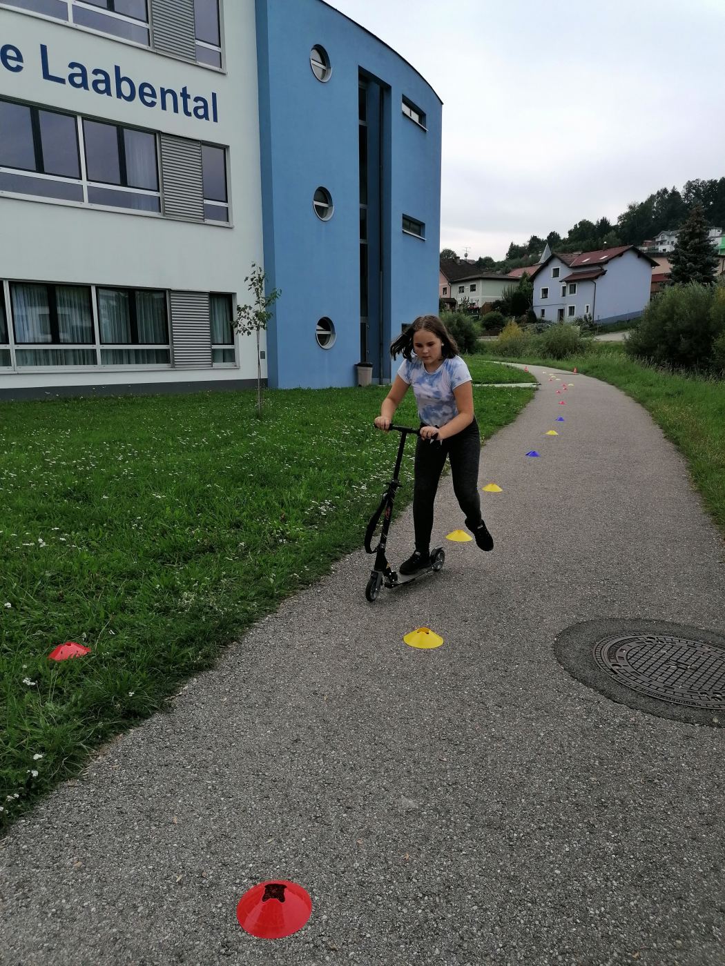 Die Schülerinnen und Schüler der 3a machten in der ersten Schulwoche ein Geschicklichkeitstraining mit ihren Rollern.
