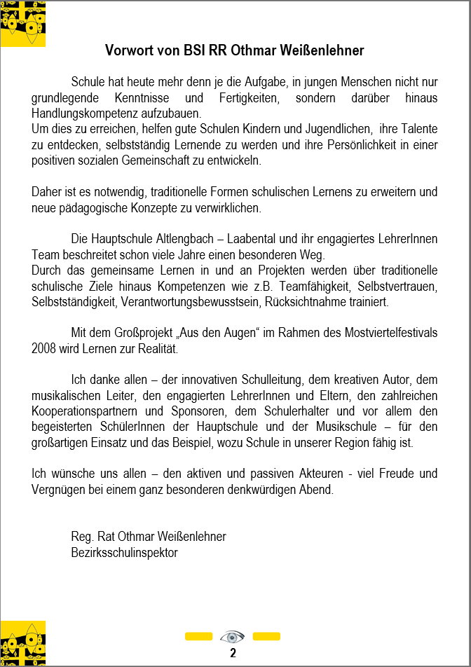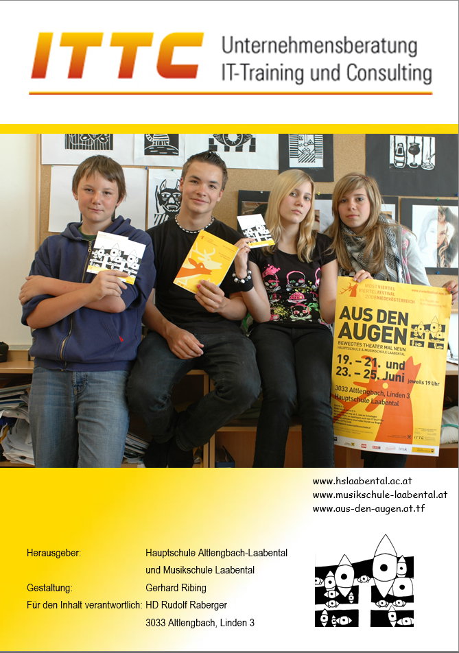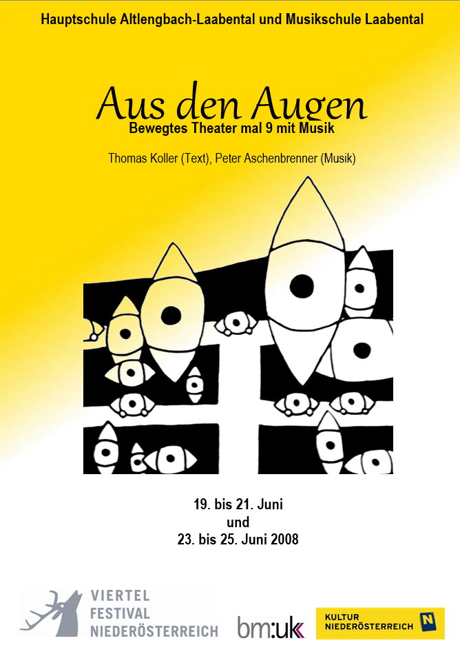 Das Motto des Mostviertel-Festivals „Spielräume“ passte haargenau auf das (bereits vorher geplante) Projekt „Aus den Augen“. Deswegen waren wir eigentlich auch nicht überrascht, in den Katalog der 89 Veranstaltungen des Festivals aufgenommen zu werden. Trotzdem erfüllte es uns mit ein wenig Stolz, dass das gelungen ist – nicht zuletzt deshalb, weil eine Produktion in dieser Größenordnung auch einiges an finanziellen Mitteln braucht. Durch die Einbindung ins „Mostviertel-Festival“ gelang es uns um einiges leichter, das Projekt auch finanziell umzusetzen.