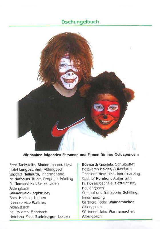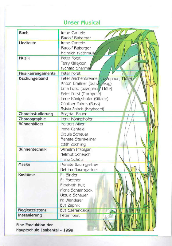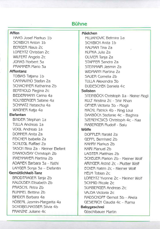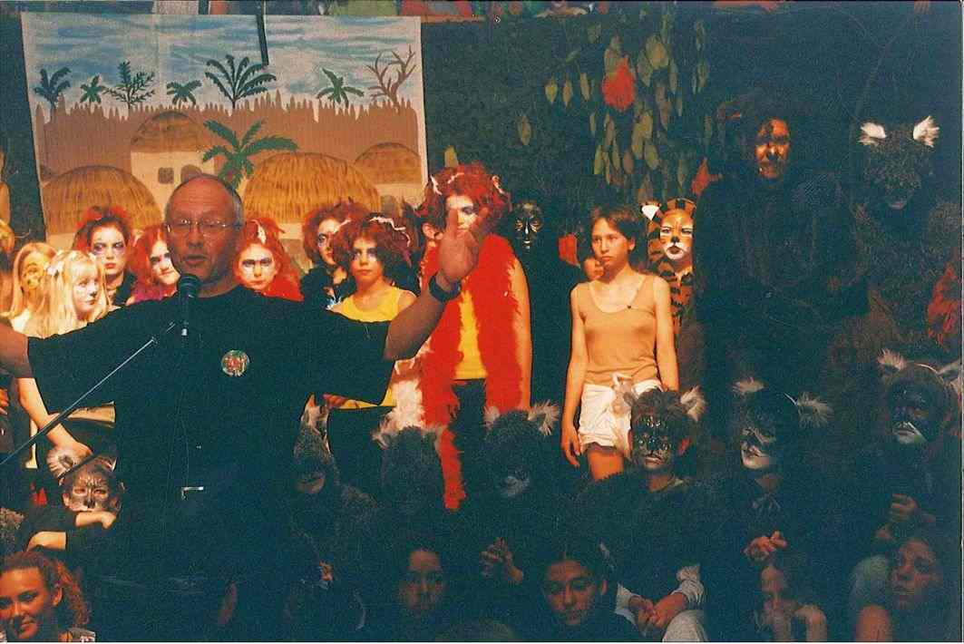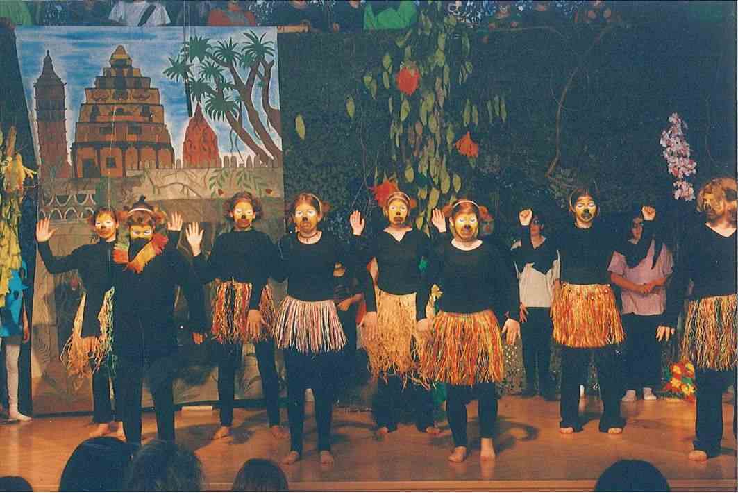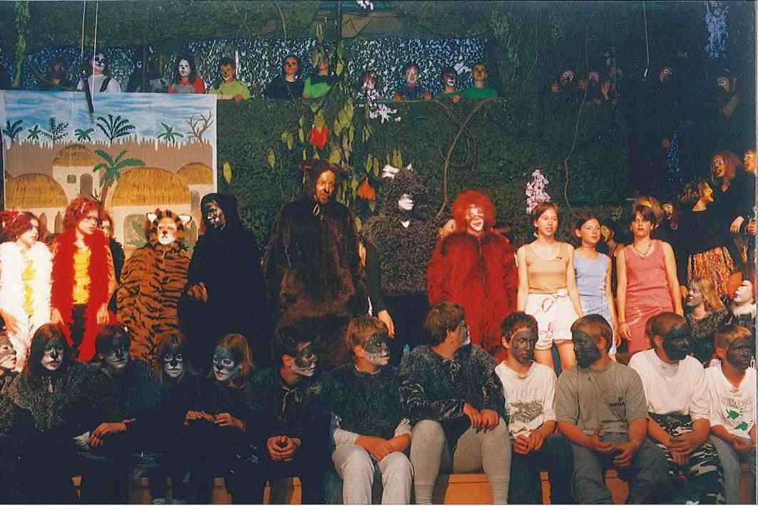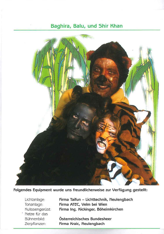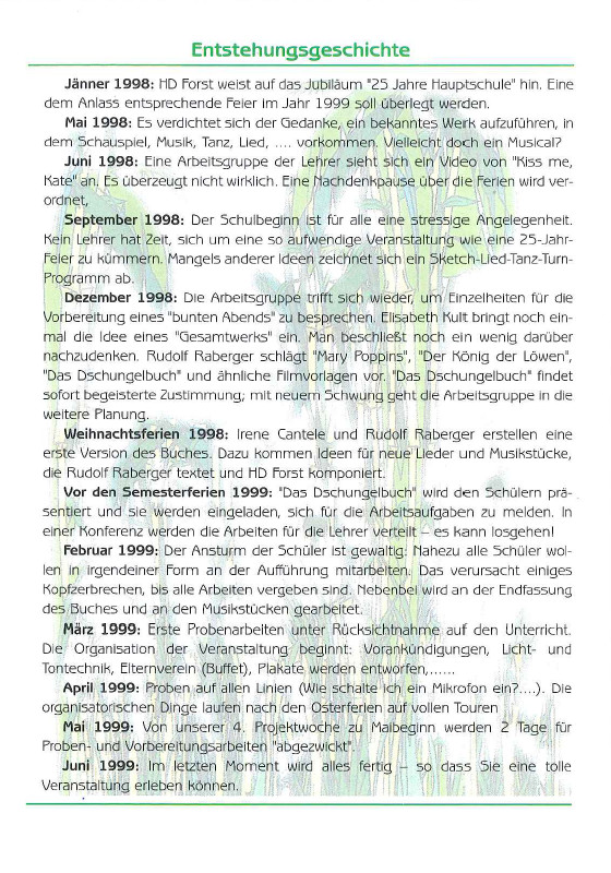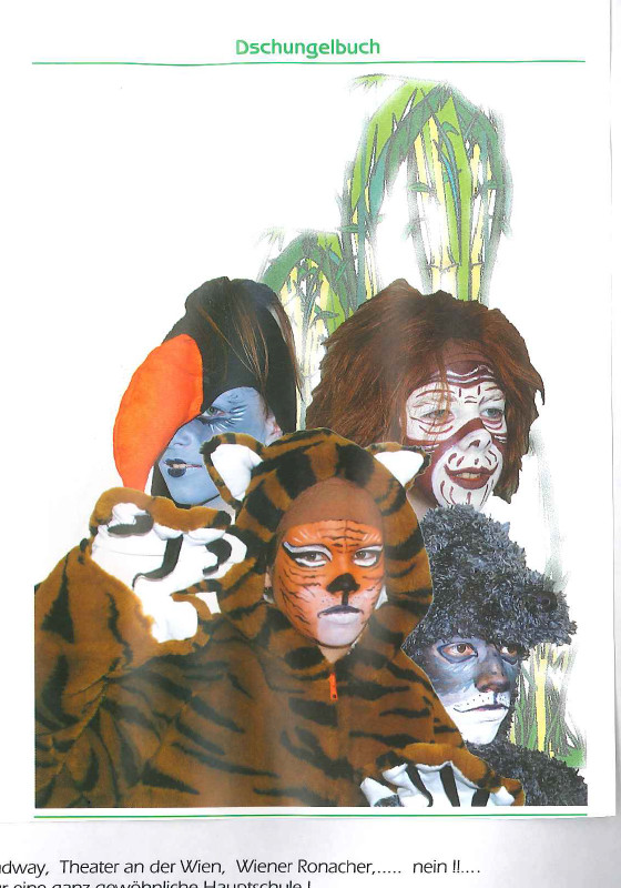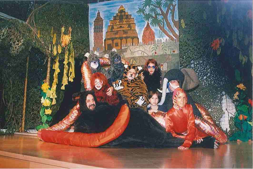 Ausgehend von unseren Erfahrungen im Projektunterricht entschlossen wir uns, ein Projekt zu starten, an dem möglichst alle SchülerInnen und LehrerInnen beteiligt sein sollten. Bald war klar, dass es sich dabei um eine musikalische Theateraufführung handeln sollte. Nach längerem Suchen stießen wir auf das "Dschungelbuch" in der Fassung von Walt Disney. Unter Zuhilfenahme dieser Vorlage erstellten wir unser eigenes Buch und Schulleiter HD Peter Forst schrieb ergänzende Musik.