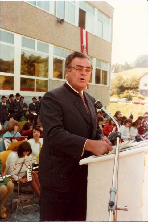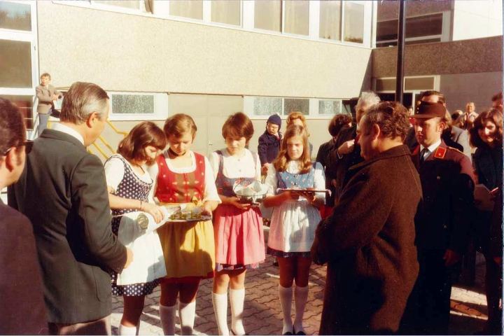 Und so geschah es dann auch ..... ! Am 19. November 1971 wurde der Kauf des Grundstückes durchgeführt, am 9. Mai 1973 erfolgte der Spatenstich durch die 3 Bürgermeister für den 24 Mill. Schilling teuren Bau. Nach 14 Monaten Bauzeit war die neue Schule fertig.